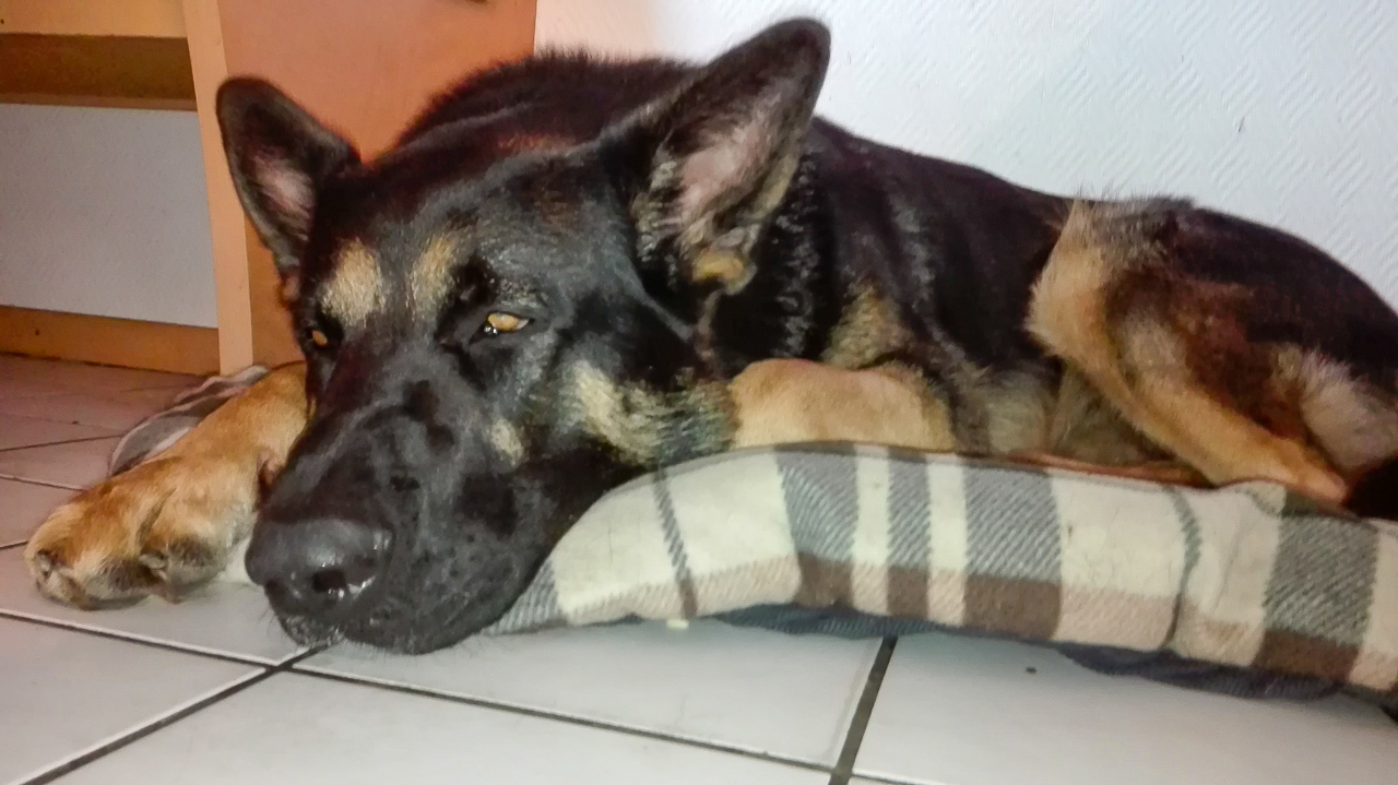 Hundewiese und viel auf dem Firmengelände rumgestromert; nun ist Harras rechtschaffend k.o.
