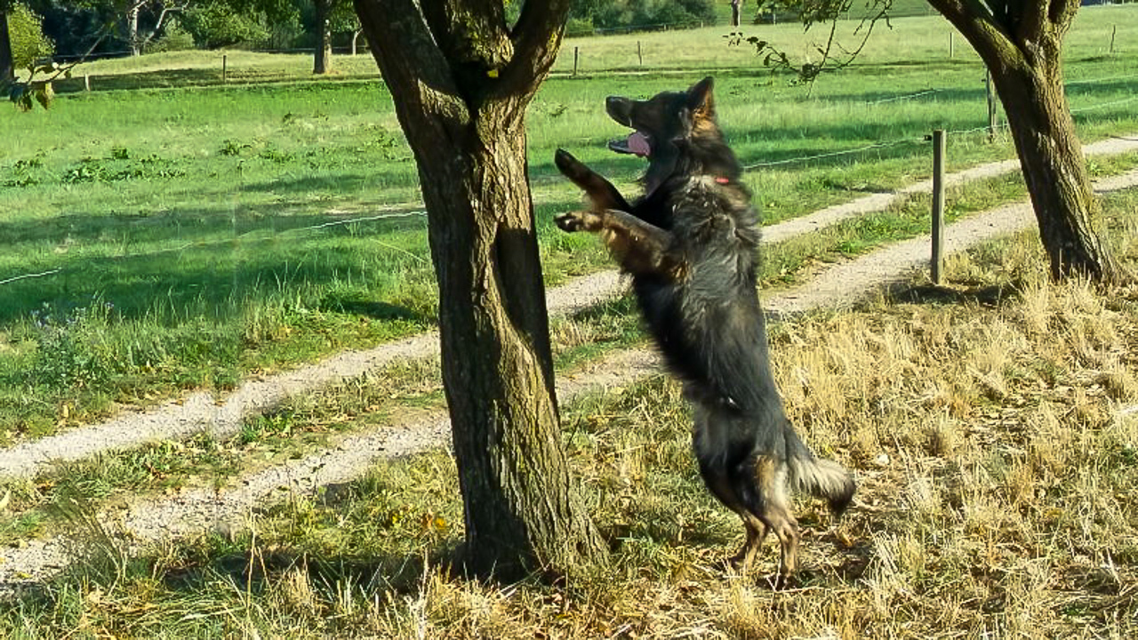 wir machen Suchspiele: in der Astgabel kann man ein kleines Stückchen Apfel erkennen. Er hat sich tierisch strecken müssen ...