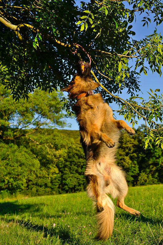 Sein Spielzeug landete am Baum. Bevor die Frauchen den Baum erreichte, um es selbst runterzunehmen, war Gin früher da. Kein Wunder, die Sportskanone. Der Fotograf knirpste ab.
