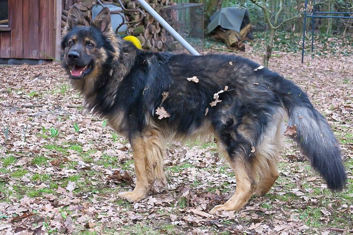 Ich wälze mich gern und habe Blätter im Fell