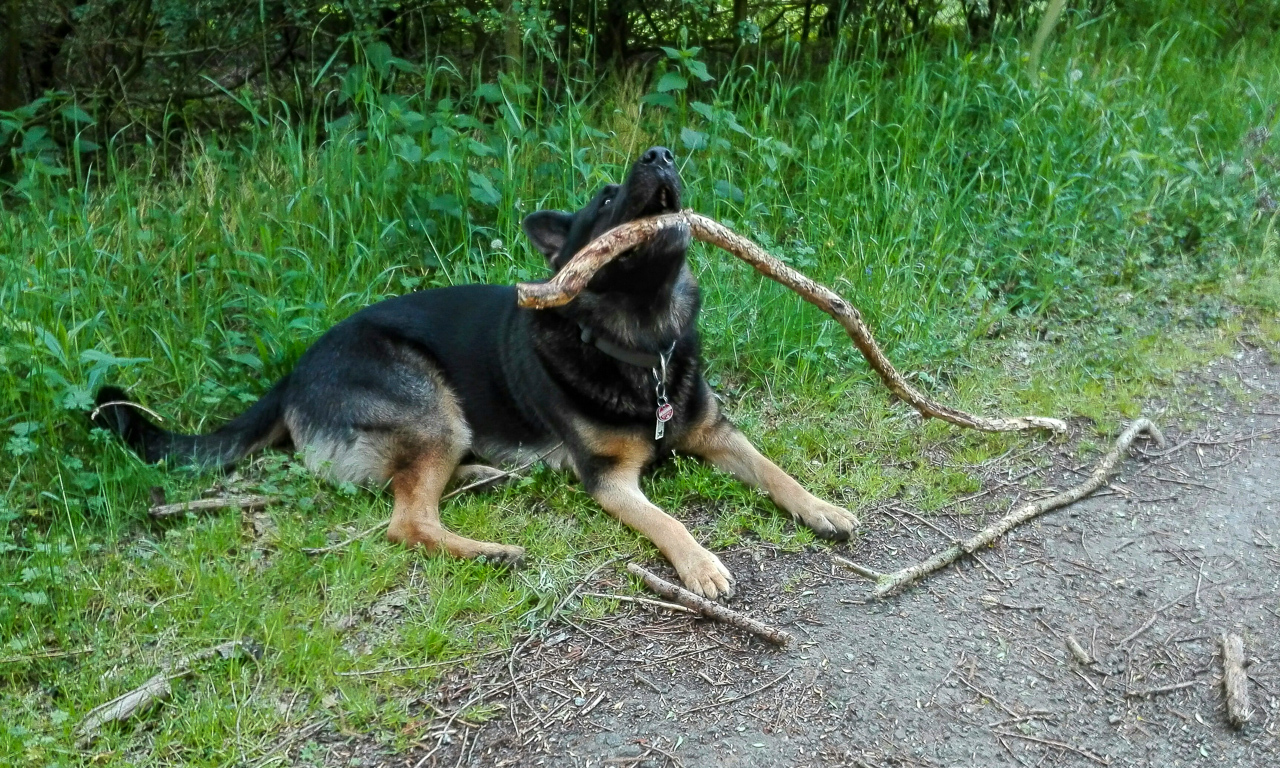 Und da ist er schon etwas keliner geworden. Harras liebt es einfach, die großen Stöcker, schon fast Äste, eine Weile zu tragen und dann klein zu machen.