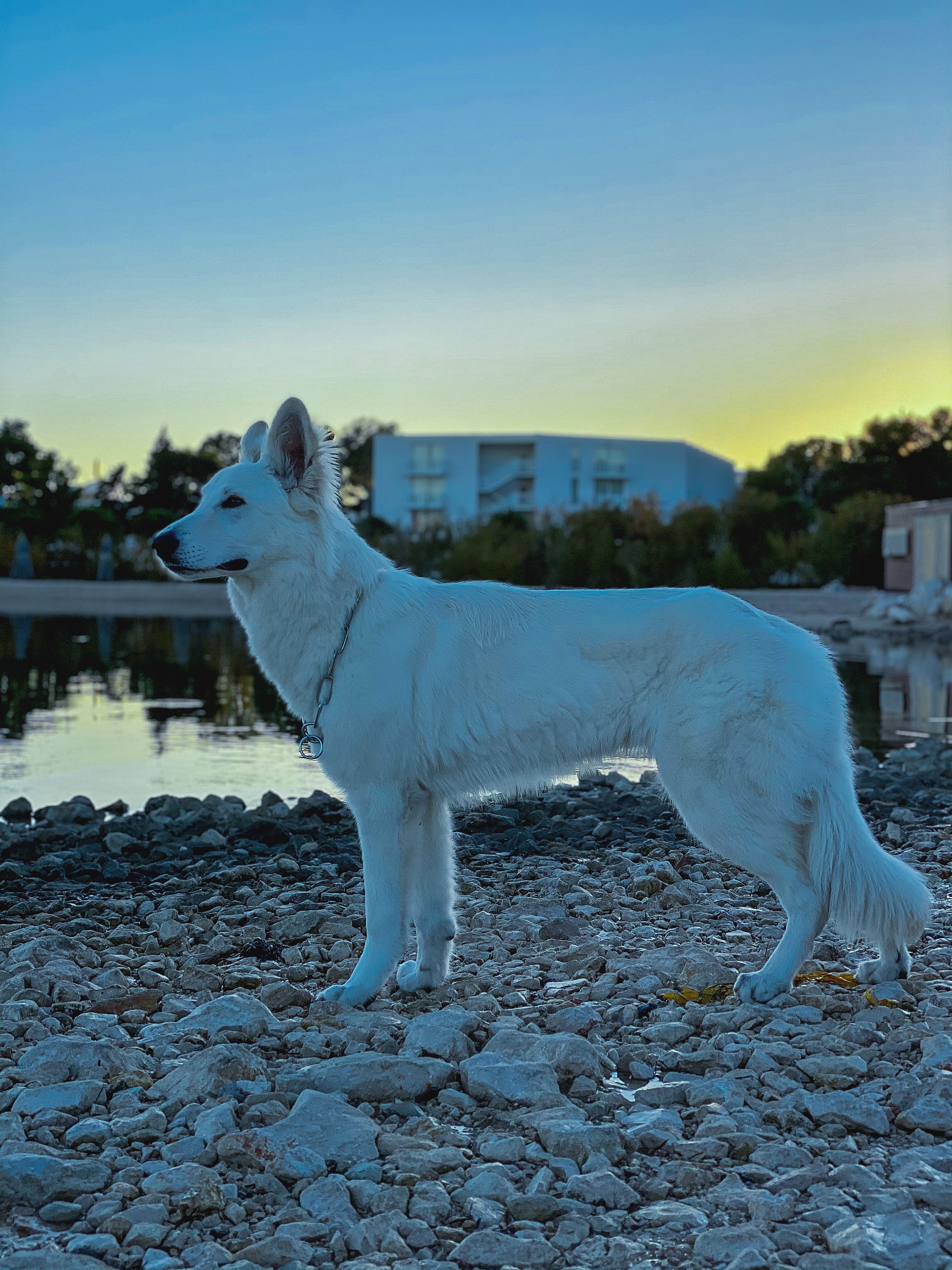 So muss ein Schäferhund aussehen. Schöner gerader Rücken und abfallende Kruppe. Er steht auch schön. Nicht so schräg gestellt wie es bei den DSH gerne gemacht wird. Habe auch schon auf einer Ausstellung bei den Weißen mitbekommen das die Richter es garniert mögen. O-Ton: Wir sind hier nicht bei den DSH.