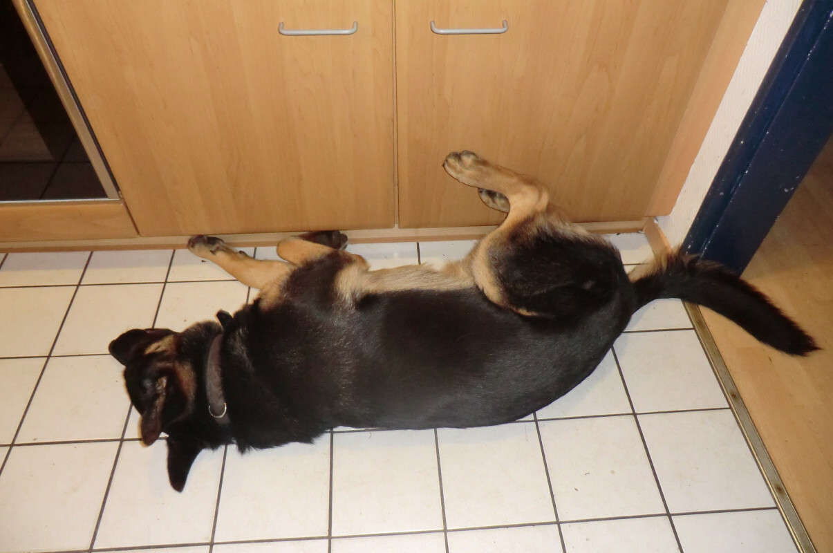 Meistens braucht Harras beim Schlafen irgend eine Begrenzung, i.d.R. am Rücken. Manchmal geht es aber auch anders herum