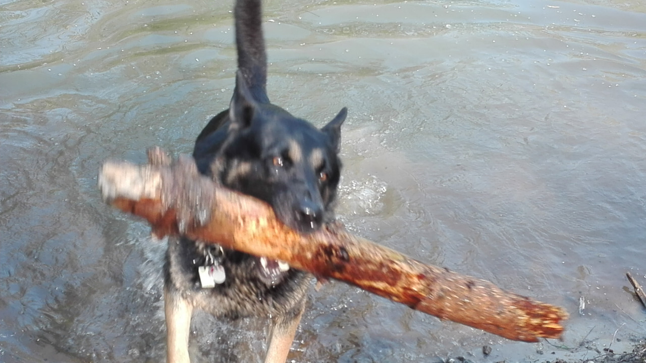 Braver Harras! Er räumt den Bach (oder Fluss oder See?) auf!