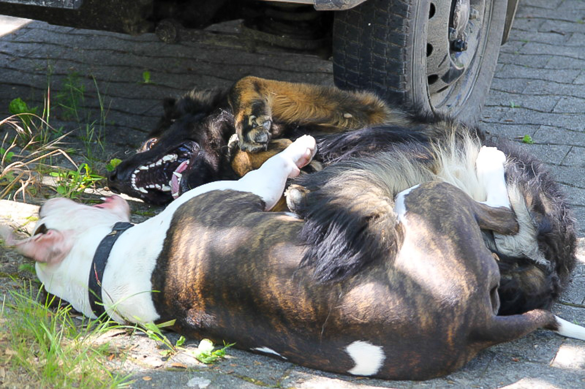 so lustig war es garnicht - obwohl es einige Jahre her ist, weis ich noch genau: es ging sehr turbolent zur Sache, ein eher grobes Spiel - und da es sehr heiß war, lagen sie dann erschöpft da