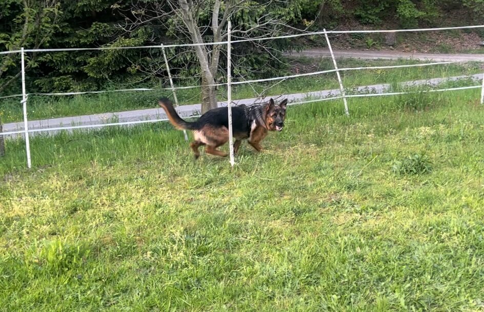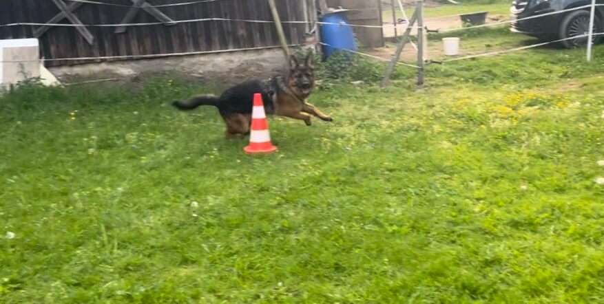 Ares hat das ziemlich schnell gut gemacht. Ich habe dann die Distanz Schritt für Schritt vergrößert und nun und bin ich schon eine Weile dabei, ihn auf Handzeichen um verschiedene Gegenstände (habe bei mir nur Weidepfähle und Pylonen) zu schicken und zur Belohnung gibt es den Ball.