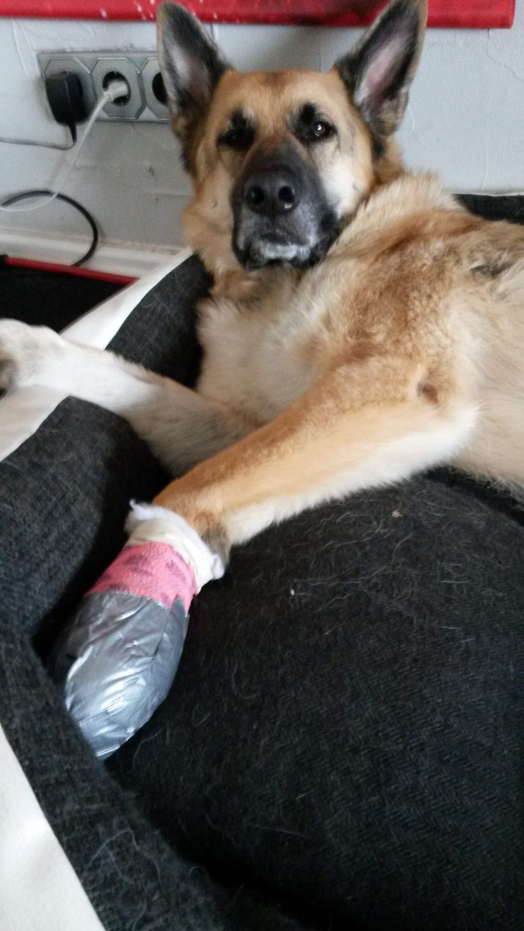 Rocky musste gestern unter Vollnarkose operiert werden. Etwas hat ihm die Pfote von unten nach oben komplett durchstossen. Dabei ist wohl was abgebrochen und in der Pfote nach oben gewandert. Er hatte eine sehr grosse Eitertasche, die bei der Untersuchung aufgeplatzt ist. Nun muss der Stinker mehrere Tage Ruhe halten. Das ist nicht leicht für den alten Adrenalinjunky ...