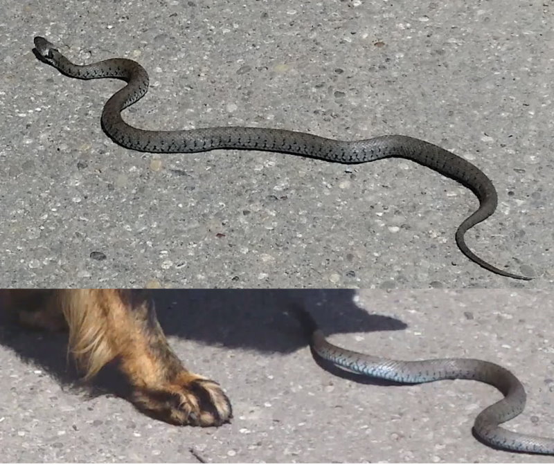 Es gibt hier in Deutschland aber auch giftige Schlangen. Ich würde meinen Hund nicht so dicht an einer Schlange lassen, bzw. sofort abrufen.