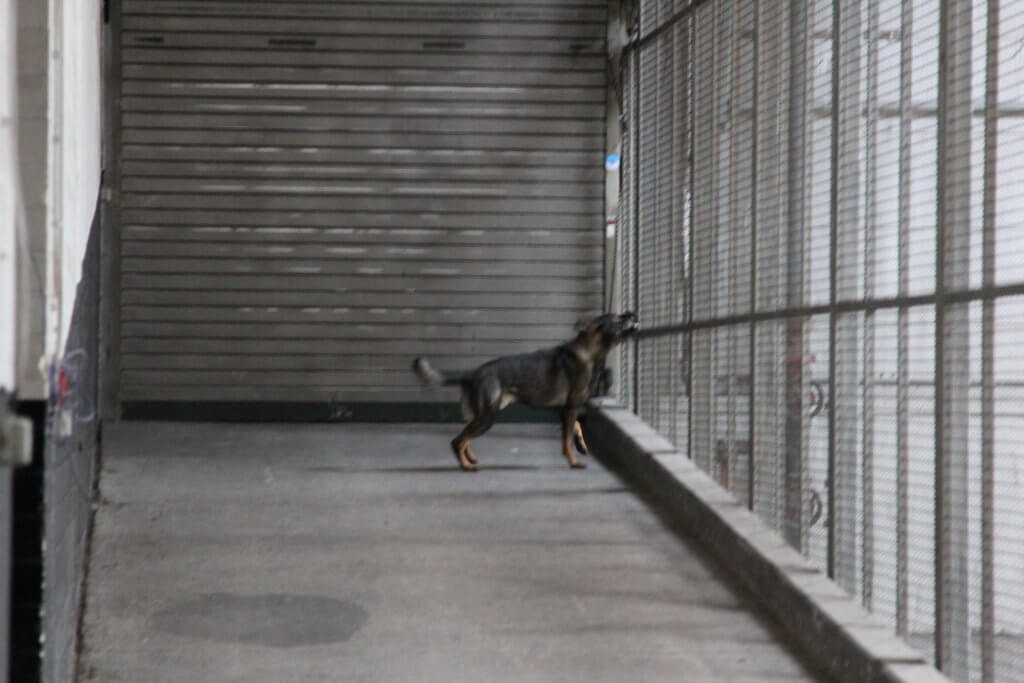 9.Fortsetzung zu Bild 8. Hermann ist um die Gitter herum gelaufen und verbellt nun direkt unter der VP. (links von Hermann ist die Gitterwand). In der Trümmerarbeit/Gebäudesuche ist es wichtig, dass die Hunde so nah wie möglich die Geruchsquelle ausarbeiten, damit eine genaue Lokalisation der VP möglich ist.