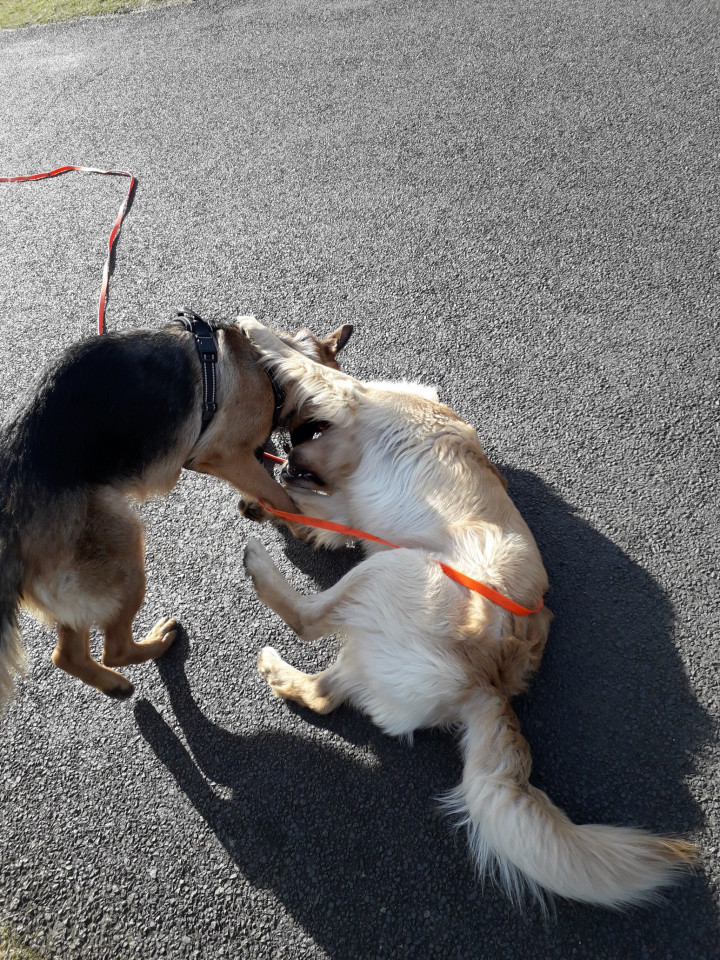 Dogmeat hatte auch mal eine kurze Phase wo er gemeint hat wenn ihm irgendwas nicht gepasst hat, er muss an mir hoch springen, in die Leine beissen, aufdrehen.