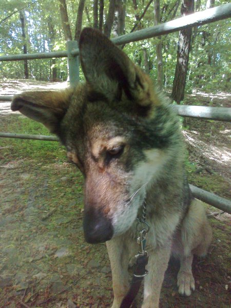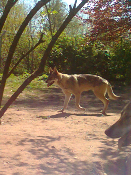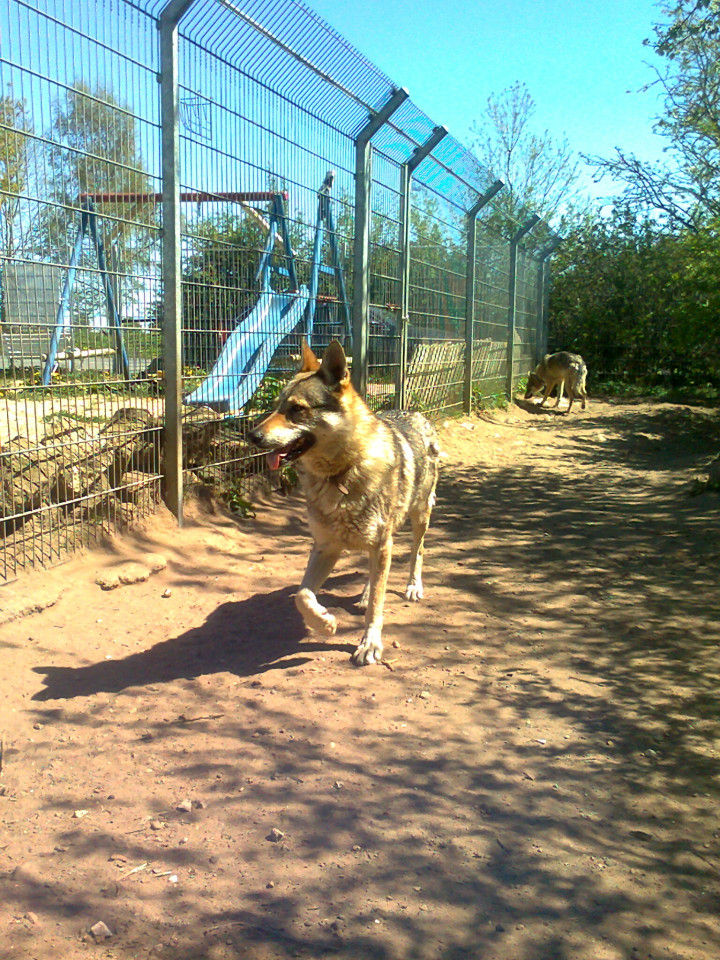 Amarok in Bewegung. Das ist ein wirklich wunderschöner Rüde. der eine unheimliche Würde ausstrahlt und andererseits,wenn er entspannt irgendwo liegt genauso eine unendliche Ruhe und Empfindsamkeit. Laut Marcel soll er ausgesprochen fürsorglich sein. Er soll,als -wider Anweisungen- eine Tür offenstand,einen Futtersack geklaut haben,ihn aufgerissen und dann dem Rest des Rudels überlassen haben. Ich hätte das Päärchen wirklich gerne weiter zusammengesehen. Sogar ein Patenvertrag hätte man eine zeitlang gemacht. Aber es ist mir shclichtweg unmöglich auf Dauer das Finanzielle sicherzustellen,oder auch organisationstechnisch zwei Wolfhunden angemessenes Wohn,-Beschäftigungsverhältnisse zu bieten.