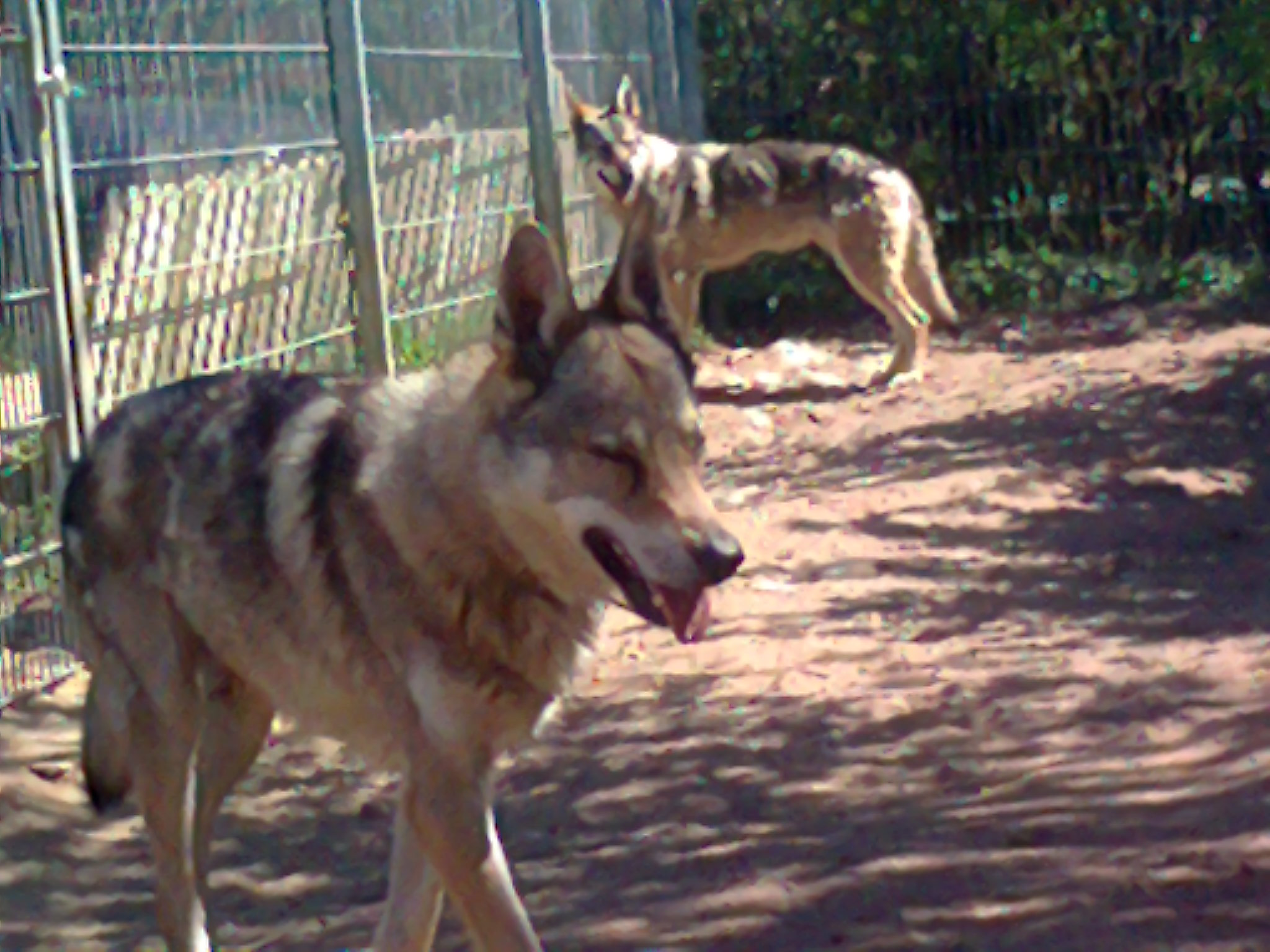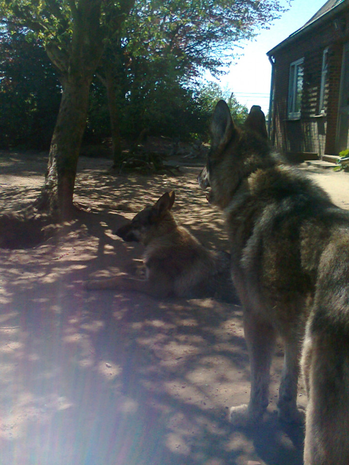 (Links) Elvis der konsequent menschenscheue Sohn von Buffy (der zweite Sohn wurde mittlerweile dem Rudel entnommen,weil er verletzt wurde). Allerdings ,sollten fremde Hunde Anstalten machen sich dem Zaun zu nähern (die Seite ist der Eingangsbereich),ist er mit seinem Vater Amarok stets zur Stelle (freilich so entfernt wie möglich von mir).