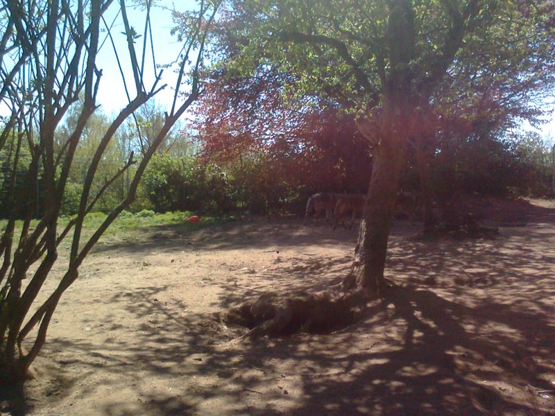 Umai und Buffy. Hinten im Schatten liegen die Rüden. Buffy war bei mir vorne,weil ich sie bürstete. Umai gesellte sich da mit dazu.