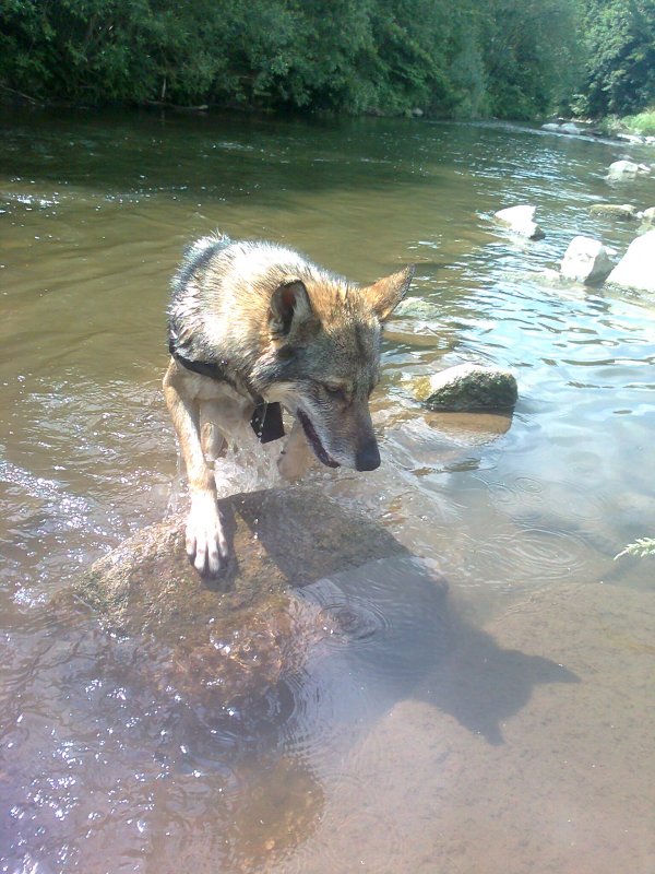 Apropos Versuch. Der Gehorsam ist wirklich völlig anders als zum DSH,der sofort ganz Ohr ist wenn man etwas sagt. Das KANN auch bei Buffy so sein. Aber es kommt immerwieder auch mal vor,das die eben erstmal noch was anderes machen "muss". Hauser würde nun sagen:"Der Hund sucht sich heraus wann er ignoriert". Da ist auch was drann. Nur der Hund ignoriert nicht um es nicht zu machen. Sondern lediglich später. Ich habe das gestern mal in einer doch extremeren (zeitlich gesehen) Situation ausprobiert. Also ich sage zur unangeleinten Buffy Rudel. Da kann sie sich von rechts nähern und sich versetzt hinter mich setzen,oder aber ähnlich wie beim Fuß nur andersherum, von links mich umlaufen und dann hinsetzen. Sie nimmt grundsätzlich jedes Wasserloch mit und war auch den Weg-wir waren am Ufer- in den Teich. Vorne kreuzte aber ein Weg und ich woltle sie einfach der Form halber ins Rudel rufen. Sie stockte auch kurz,lief dann aber in den Teich. Nun gut. Ohne nasse Füße konnte ich sie eh nicht herausholen,einfach weiterlaufen wollte ich nicht,ewig rufen ohne Konsequenzen lehrt nur das es eben keine Konsequenzen gibt. Ich wiederholte nochmal sanft mein "Rudel" und wartete. Buffy derweil schaufelte mit dem Maul nochmal Wasser,tauchte nochmal mit den Kopf ins Wasser ein und hob ihn schüttelnd shcnell (was wie ein Wasser über sich selber schütten wirkt),machte das so zwei dreimal und kam dann heraus. Aber nicht einfach heraus sondern schnurstracks zu mir,setzte sich hinter mich hin,schaute mich an wie:" So,ich bin fürs Leckerlie jetzt bereit." :D:D Wie Anna Hein in ihren Blog "Warum einen Wolfhund?" geschrieben hat,hat man stets das Gefühl das der Hund schon weis das er nicht müsste,aber es eben doch macht. "Weil du´s bist.". Besteht man dagegen auf prompte Ausführung,korrigiert etwas "ungehaltener" (muss man im Verhältniss sehen:gemeint ist das man mit tieferen unwilligerne Ton den Hund beispielsweise an der Leine in Position bringt-ohne weitere Einwirkung) wird sie sofort widerwillig,ignorant. Sie wehrt sich nicht! Aber sie dreht sich weg und ist auch nicht mehr für ein Leckerlie bereit einen anzuschauen. Ihr Körpersprache ist dann eindeutig auf Abstand getrimmt. Es geht also mit ihr tatsächlich nur auf einer stets freundlich,freudigen,sanften,durchaus Freiraum gewährenden Ebene.