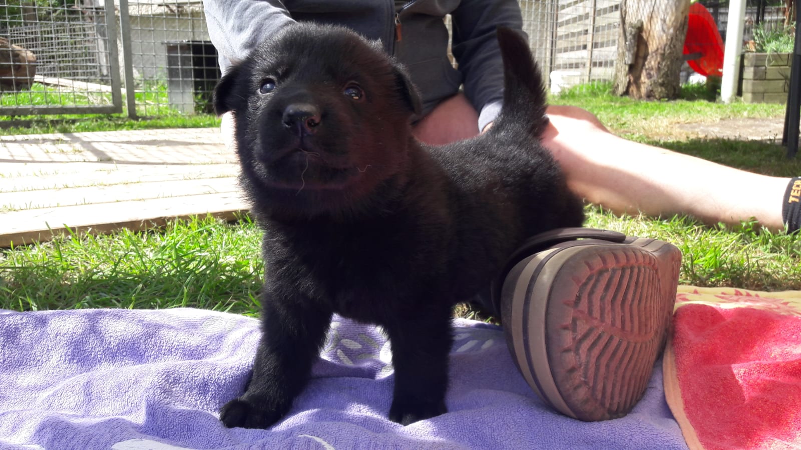 Bis jetzt ist er ein eher ruhiger Welpe im Wurf, meldet jedoch als erstes, wenn die Gehegetür zum Auslaufbereich aufgeht und jemand hineinkommt.