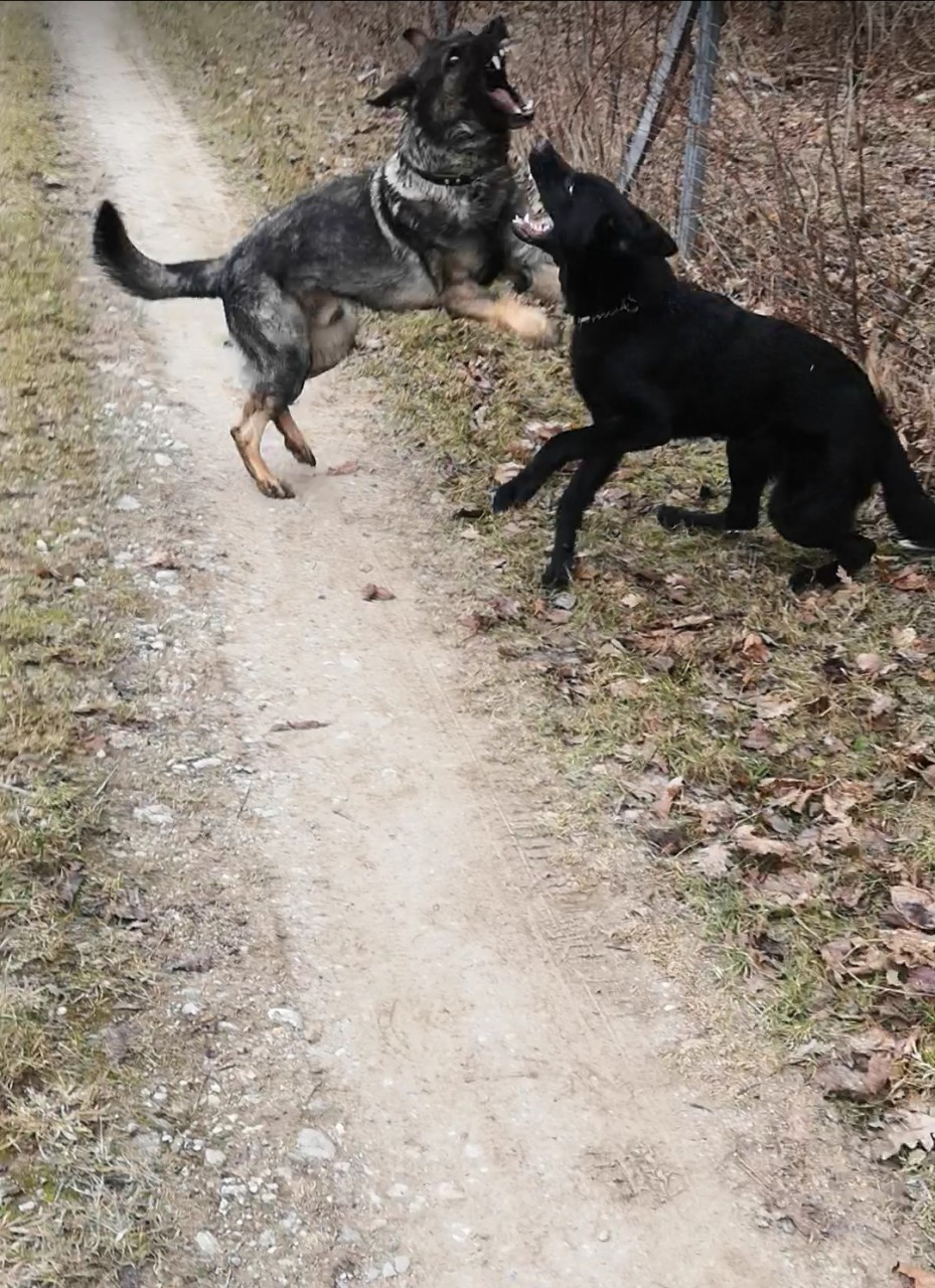 Ihr Schäferhund bellte Onyx an, sprang auf ihn drauf, "wollte Spielen" - jedoch ohne Unterwürfigen Beigeschmack und siehe da .. Onyx' Blick war unbezahlbar !! Ich musste so lachen, er sah seinen Spielpartner derart schockiert an, warum er nun so war, Onyx verstand die Welt nicht mehr. Danach war Ruhe, sie rannte gemeinsam voran und schnüffelten herum , aber es gab kein hohes Onyx' Gebelle, weil der junge Herr ja spielen möchte.