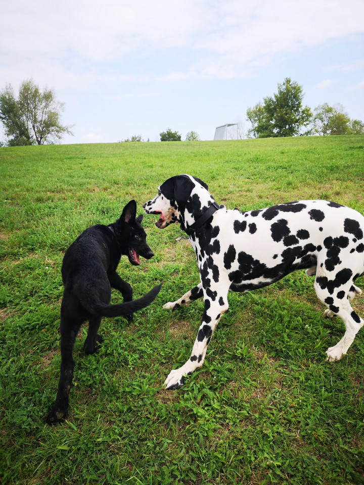 Beim Aufreiten schreite ich schon selbst ein, da braucht kein anderer Hund was machen. Aber es sind so Sachen wie, ein anderer Hund verwarnt mit Zähne fletschen und Knurren, weil dieser eben keinen hibbeligen Welpen um sich haben möchte und was macht Onyx, er bellt fröhlich drauf los und rückt dem Hund an die Pelle. Mit dem Arsch sozusagen ins Gesicht. Ich möchte dass mein Hund kommunizieren kann, das muss er halt dann auch von anderen Hunden beigebracht bekommen und nicht von mir als Mensch, denn da weiß er zwar, wann er aufhören soll, wenn ich ihm das sage, aber mehr auch nicht. & wenn ich nicht immer 100%ig dahinter bin, was dann? Dann eskaliert es irgendwann einmal. Aber ich denke, in 1-2 Monaten sind die meisten Hunde dann auch anders gestimmt und reagieren entsprechender. Das muss ja nicht böse enden. In der Hundesprache spielt sich so vieles ab. mit einer kleinsten Bewegung kann ein Hund sich so deutlich erklären, das sehen wir Menschen meist gar nicht auf den ersten Blick und das sollte Onyx wenn möglich alles beherrschen, dann habe ich im späteren Jahren weniger Arbeit mit ihm