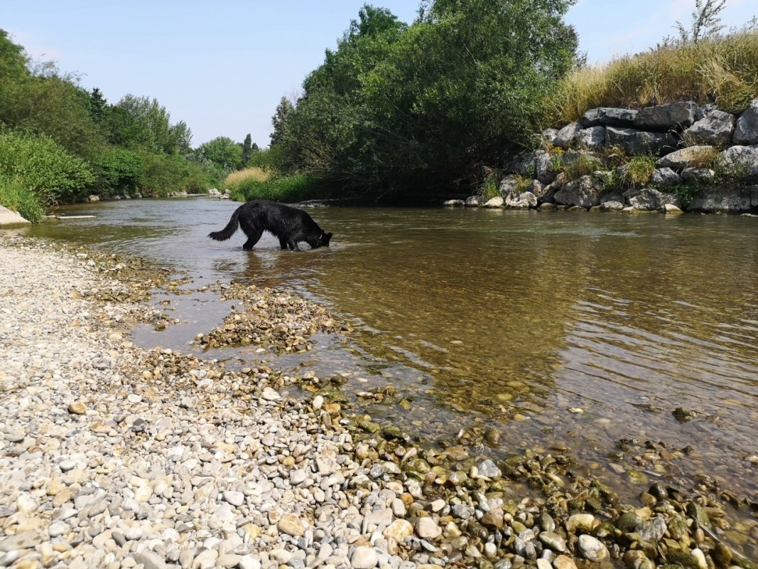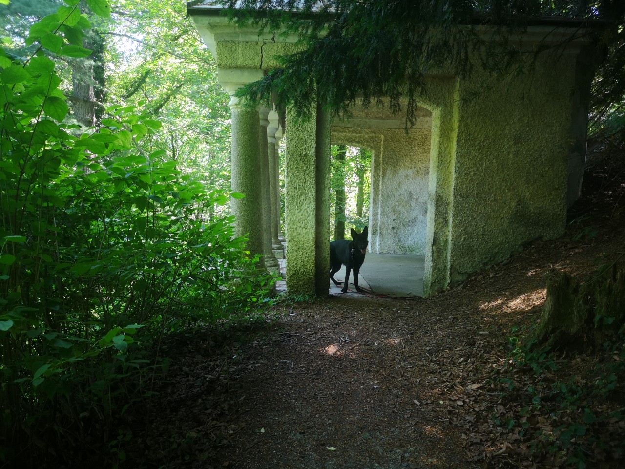 Am Grünen See war er wirklich brav. War natürlich ganze Zeit an der Schlepp. Durfte manchmal ins Wasser springen zur Abkühlung und stand wie ein Profi vor der Kamera um Fotos von ihm machen zu können. Der Hund ist wirklich bemerkenswert. Ich rede mit meinem Freund, dass diese Kulisse sich recht gut anbieten würde, für ein Foto und schon steht der Hund dort mitten drin und wartet gespannt bis man abdrückt und die Bilder im Kasten hat. Mittags ging es dann auf eine Hütte und bis auf einige Male aufstehen und neugierig vorm Tisch stehen und schauen (ich schickte ihn dann eben wieder unter den Tisch auf den Platz) war er super brav. Es gibt ein Winseln, wenn ich mal aufstehen und aufs Klo muss oder wenn mein Freund aufsteht und kurz weggeht. Er wartet & freut sich beim Ankommen natürlich noch ziemlich intensiv. Das haben wir ja schon zu Hause umgeleitet, dass er sich dann einen Schuh nimmt oder ein Spielzeug & sich dann freut, aber draußen ist er eben noch so "Ah super, Frauli ist da, jetzt muss ich sie anspringen, ich kann meine Freude anders nicht ausdrücken" - Er muss nun immer erst sich hinsetzen und bekommt dann ein Leckerlie. Beim Streicheln verfällt er dann eben ins Hochspringen und die streichelnde Hand ins Maul nehmen.