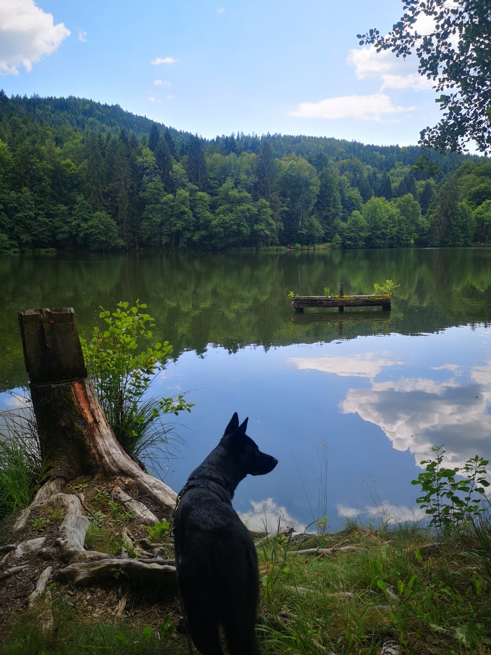 Am Grünen See war er wirklich brav. War natürlich ganze Zeit an der Schlepp. Durfte manchmal ins Wasser springen zur Abkühlung und stand wie ein Profi vor der Kamera um Fotos von ihm machen zu können. Der Hund ist wirklich bemerkenswert. Ich rede mit meinem Freund, dass diese Kulisse sich recht gut anbieten würde, für ein Foto und schon steht der Hund dort mitten drin und wartet gespannt bis man abdrückt und die Bilder im Kasten hat. Mittags ging es dann auf eine Hütte und bis auf einige Male aufstehen und neugierig vorm Tisch stehen und schauen (ich schickte ihn dann eben wieder unter den Tisch auf den Platz) war er super brav. Es gibt ein Winseln, wenn ich mal aufstehen und aufs Klo muss oder wenn mein Freund aufsteht und kurz weggeht. Er wartet & freut sich beim Ankommen natürlich noch ziemlich intensiv. Das haben wir ja schon zu Hause umgeleitet, dass er sich dann einen Schuh nimmt oder ein Spielzeug & sich dann freut, aber draußen ist er eben noch so "Ah super, Frauli ist da, jetzt muss ich sie anspringen, ich kann meine Freude anders nicht ausdrücken" - Er muss nun immer erst sich hinsetzen und bekommt dann ein Leckerlie. Beim Streicheln verfällt er dann eben ins Hochspringen und die streichelnde Hand ins Maul nehmen.