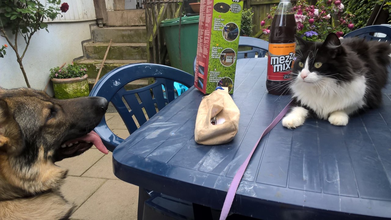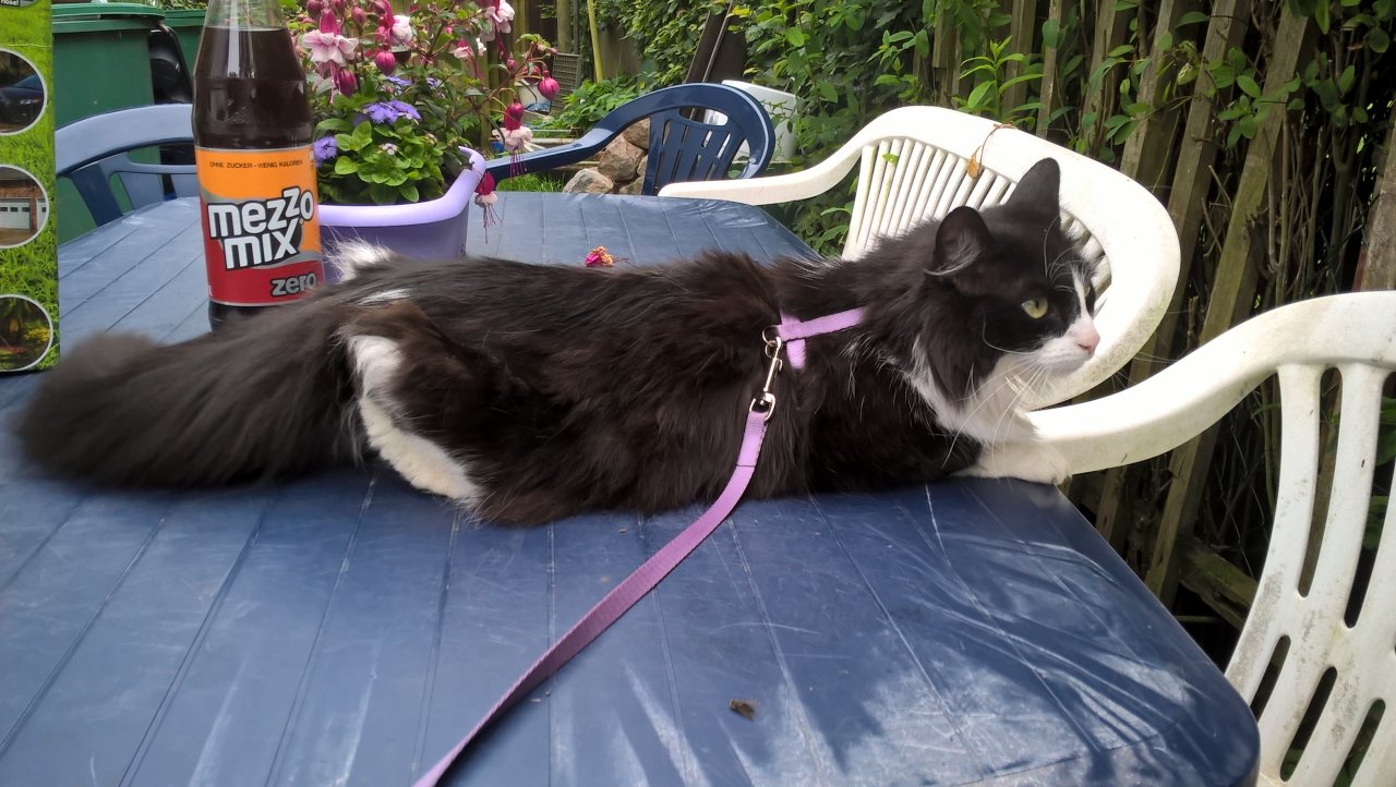 zum Haushalt gehören Aiko (DSH, 10 Jahre), Dina (DSH, 16 mon.), Mietzi (Katze, ca.10 Jahre), Tinka (Katze, 4 Jahre), ca. 40 Kanarienvögel, meine Mutter, mein Bruder und ich (Alexandra,43Jahre).