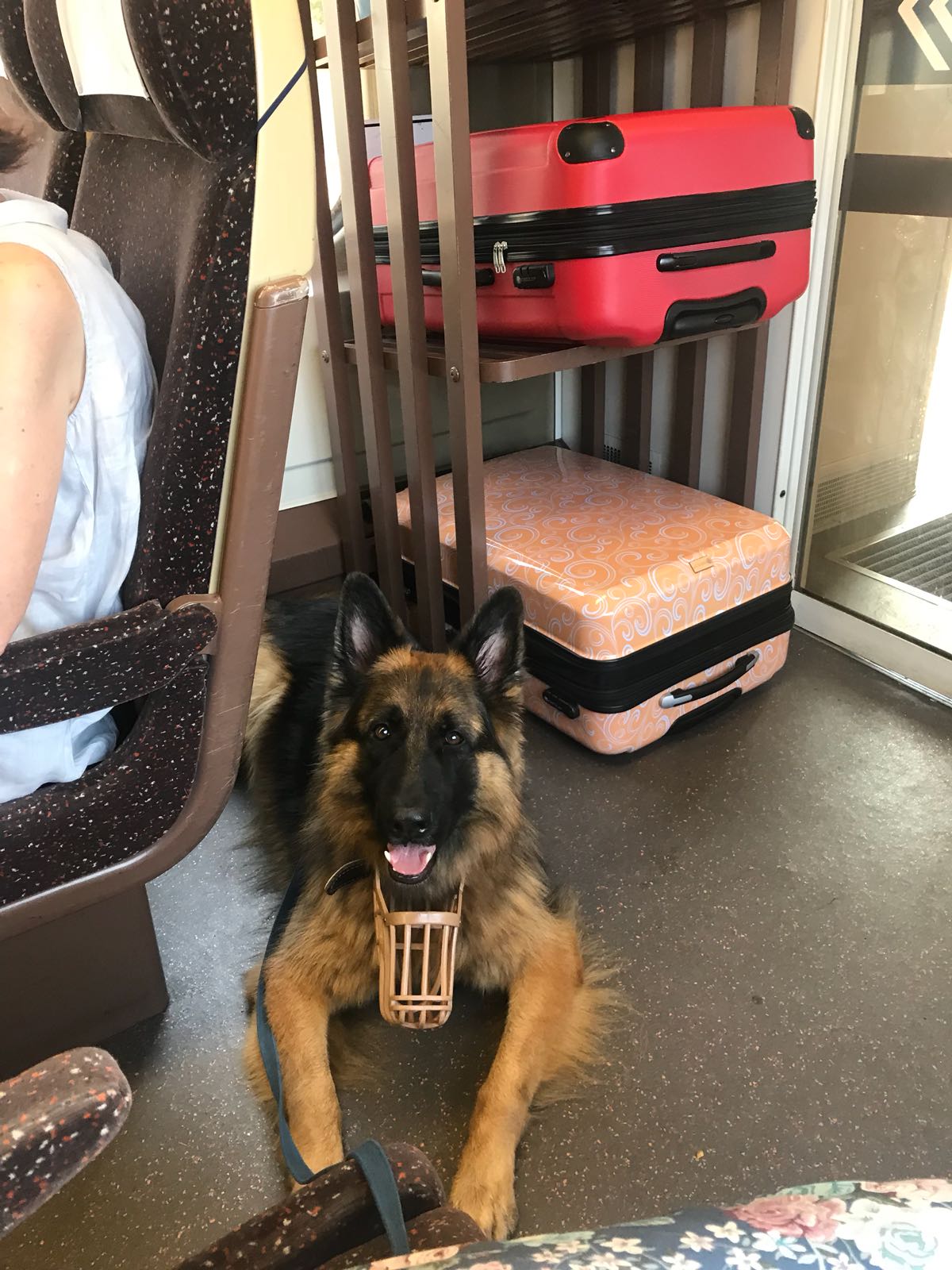 Dann kam die Erlösung: ganz am Anfang von Wagon war ein Platz für die Kofer und dazu noch Platz für Behindertgenwagen, gleich danaben waren 2 Sitze. Und eine Frau die mein Dilema sah, kam zu mir und sagte, ich darf mich auf ihren Platz setzen (der Platz war direkt bei den Behindertenplätzen). Haaah! Erlösung! Ich hatte vieeeel Platz und Gini noch viel, viel mehr. Ich könnte die Frau durchknuddeln .Im Österreich habe ich es so mit Beisskorb gehandhabt: bei Fahrschein Kontrolle habe ich es rauf gemacht und sonst hing es lose an Gin. In Tschechien habe ich ein Mal zu spät rauf gemacht und die Kontrolleurin hat nichts gesagt. Habe es dann gänzlich abgenommen und Gin durfte ohne Beisskorb bis zur Warschau. Die Leute haben sich komischerweise auch beim Durchgehen sicherer gefühlt wo Gin keinen an hatte.