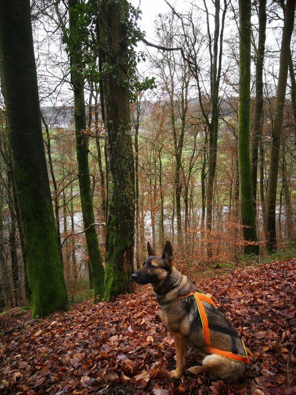 da die heutige Cachetour eine Angeltour (Caches von den Bäumen angeln) war, ist die Schleppleine dabei hinderlich, also hab ich sie für diese Tour auch ans Zuggeschirr und den Bauchgurt gemacht und die Wegführung durch den Wald war auch passend dafür, so ging das richtig gut - lediglich mein Mann war etwas schnaufend hinter mir und beschwerte sich über mein forsches Tempo