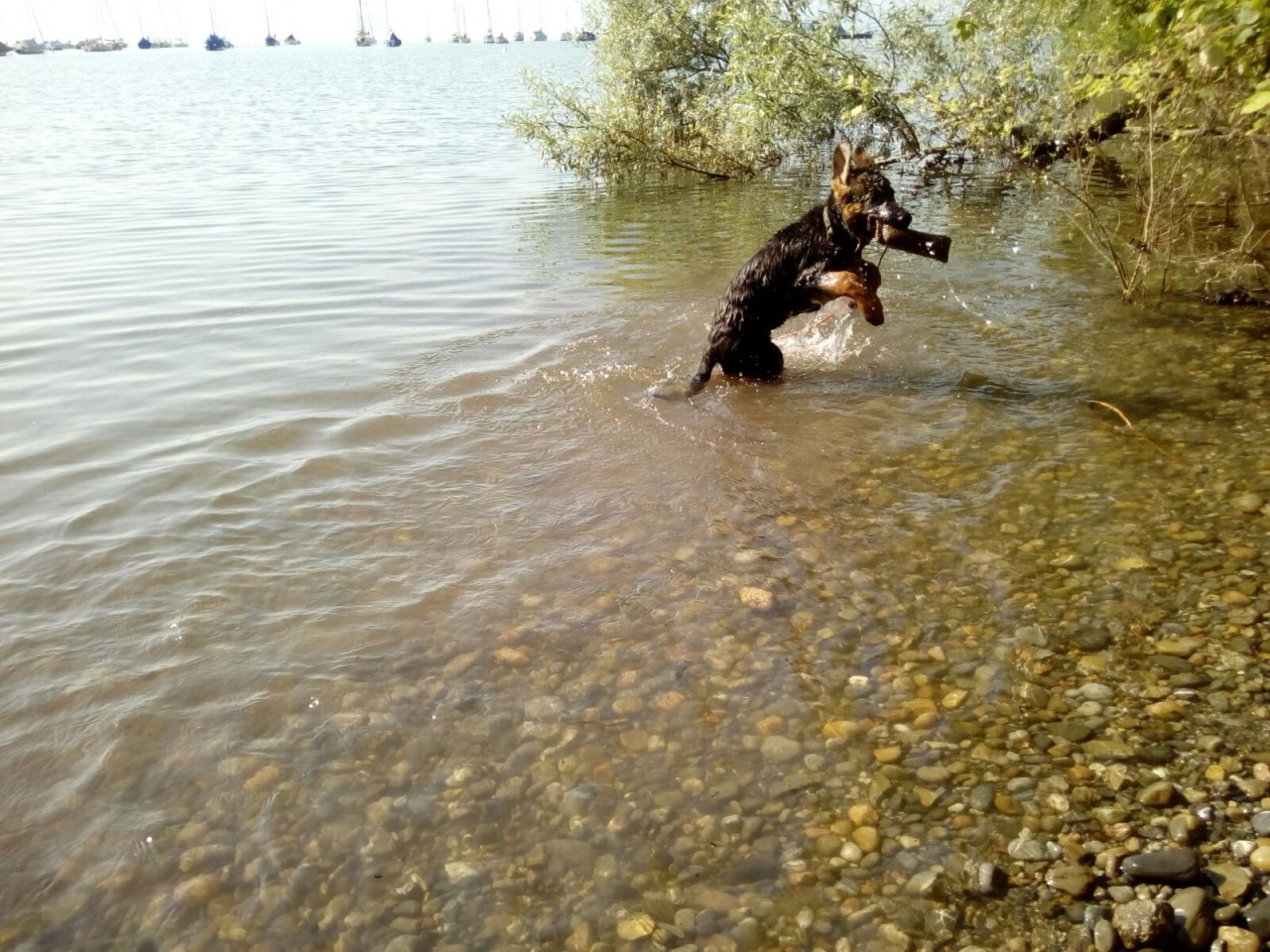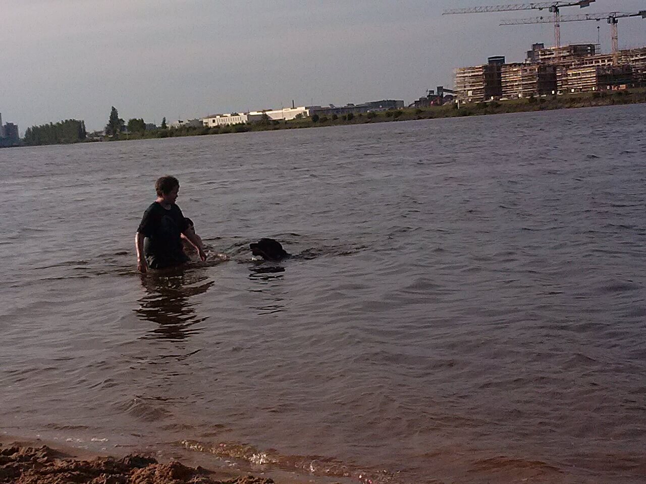 Da war ca. 1/2 Jahr alt; da hat mein jüngster Sohn ihn zum Schwimmen mit einem Ball in die Weser gelockt und seitdem ist er ein Seehund :D