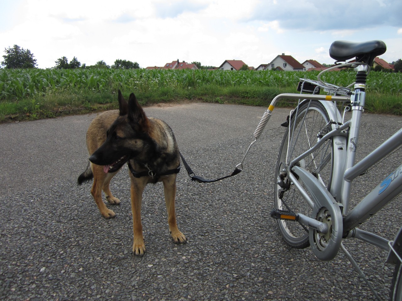 Lange hab ich's vor mir hergeschoben, aber heute sind wir dann doch unsere erste Runde mit dem Rad gefahren. Die Leine hatte ich die meiste Zeit zwischen Hand und Lenker geklemmt. Das schien mir für den Anfang besser, damit ich einwirken kann bzw. loslassen kann. Hat auch wunderbar geklappt.