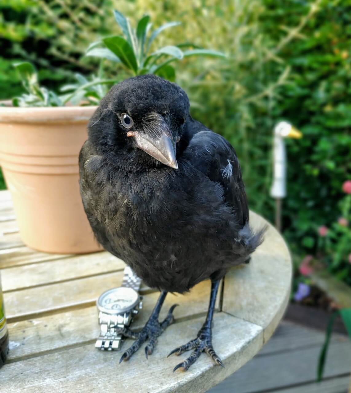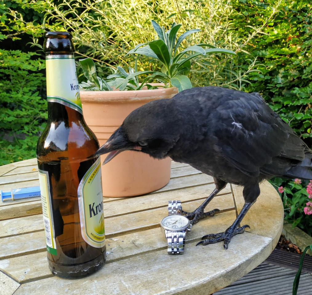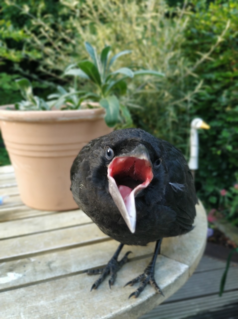 Vogel ist am Sonntag wieder aufgekreuzt. Er hockte bei unseren Nachbarn im Garten und als sie bei mir klingelten, hoppelte er begeistert auf mich zu und auf meine Schulter. Kohldampf bis unter beide Flügel...