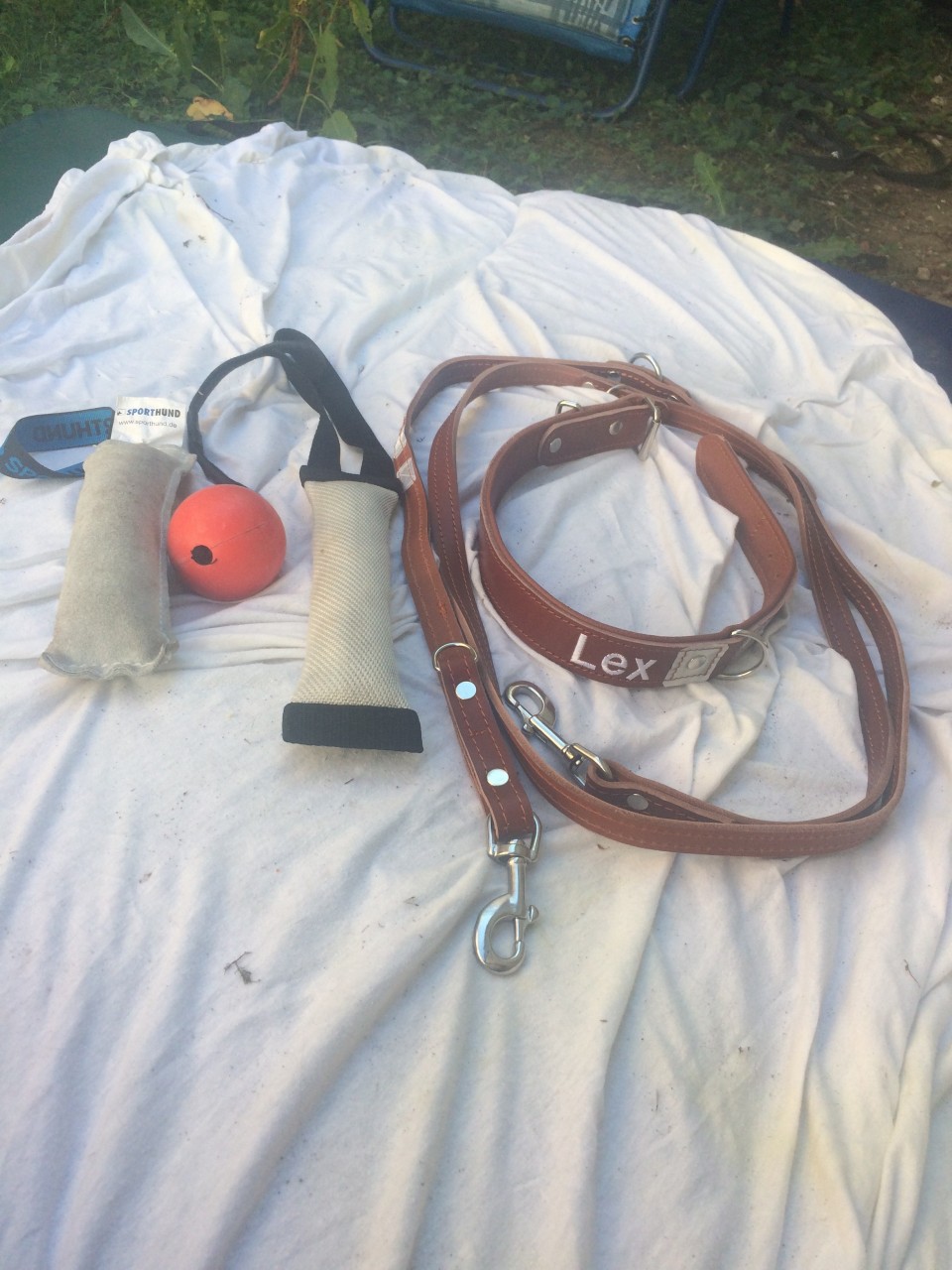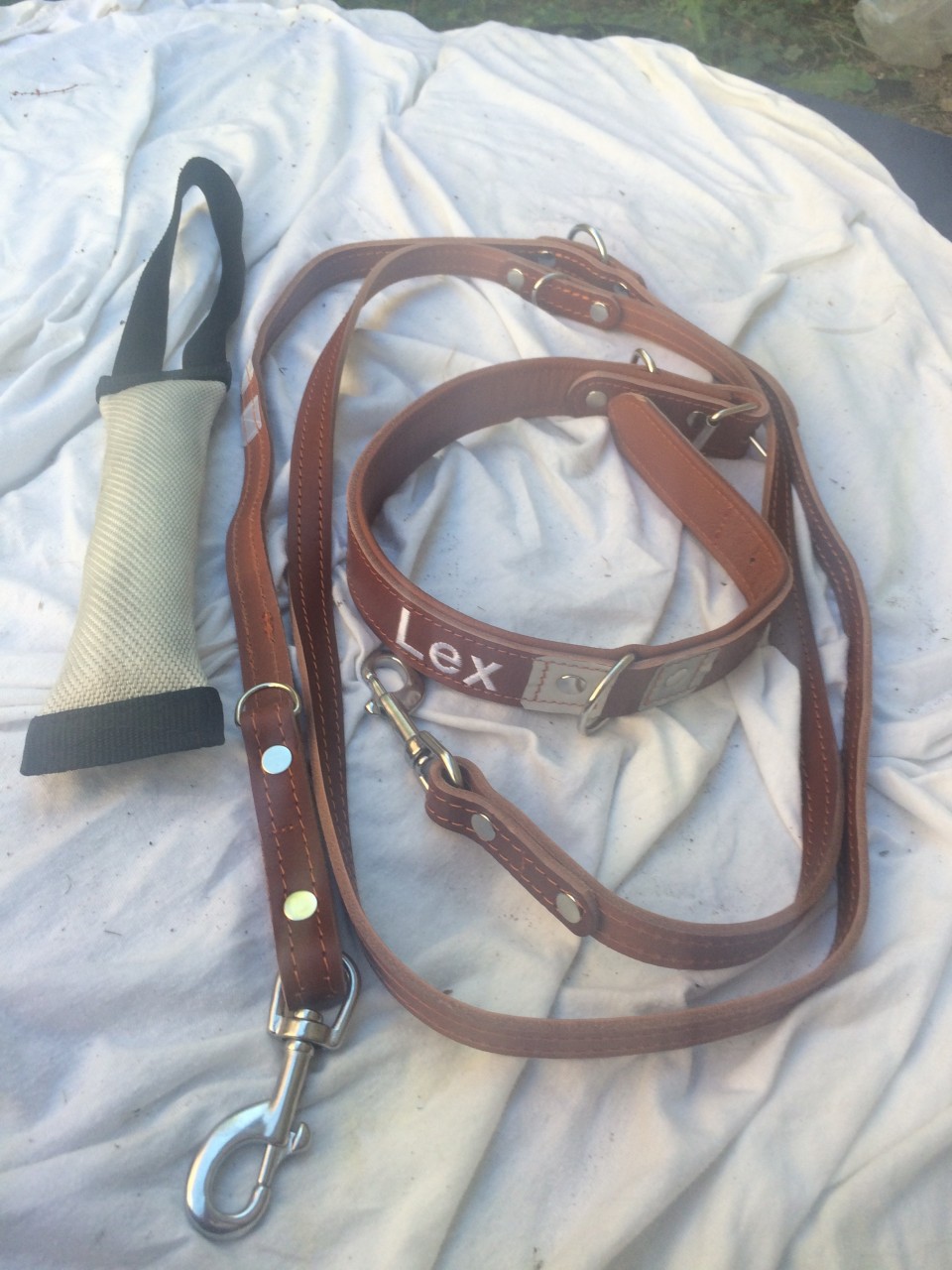 Die Leine, das Halsband aus Leder und die Beißwurst aus Freuerwehrschlauch sind vom Knastladen, es ist sehr gute Qualität und man tut noch was gutes.