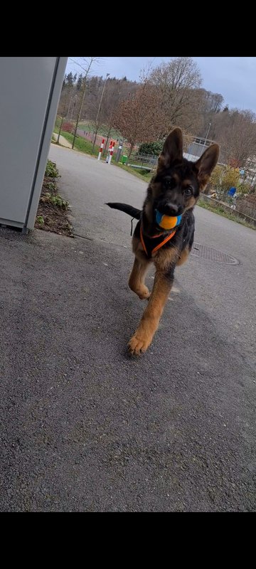 Im Moment hat er gerade Bällchen Tragen für sich entdeckt. Dadurch dass er nun den Ball tragen kann, will er kaum noch Dinge fressen Draussen.