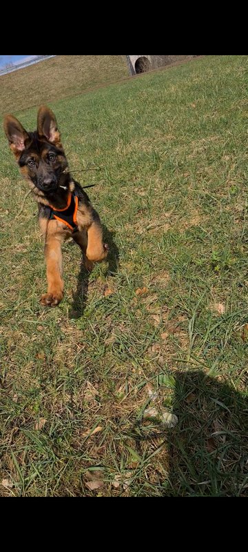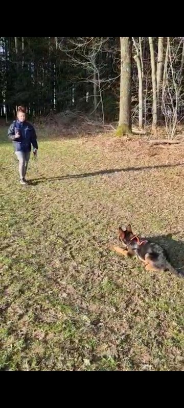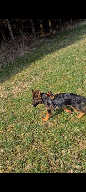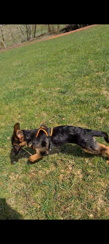 Wir hatten heute einen wunderschönen, Sonnigen Nachmittag. Wir wussten nicht so recht was wir machen sollen mit Romeo, da er ja noch geschont werden muss. Ich hatte dann die Idee dass wir doch eine Fährte legen können, da ich sowiso mal sehen wollte wie Romeo darauf reagiert. Gesagt getan, zwar kein Acker sondern Wiese ( Schweregrad also erhöht) aber ich entschied mich erstmal für eine Minifährte, die mir mein Partner auch schön brav zurecht gemacht hat. Eine Gerade und am unteren Ende des Feldes noch eine mit 2 Schlangenlinien. Zuerst war Romeo ja noch ganz ( Müde) und musste sich da erstmal einfinden. Vor der Fährte also Sitz, Anschauen, dann gings los. Abtritt war beim Stöckchen, finde meinen Startpfeil leider nimmer mehr. Langsam und noch etwas unbeholfen aber es ging. Pause und mit dem Auto ans untere Ende des Feldes gefahren und da war er, mein Romeo