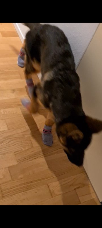 Nachdem Romeo heute auch am NM trotz Fährten am Morgen sowas von voller Energie war, bin ich mit ihm zur Wiese gefahren, wo er auch direkt losgelegt hat und 10 Minuten toben durfte. Nun schläft er tief und fest. Er trägt nun Zuhause Antirutsch Socken, da wir überall Parkettboden haben und er immernoch viele Phasen hat wo er innerhalb von paar Sekunden plötzlich überdreht und manchmal auch rutscht. Er hat sich bereits gut daran gewöhnt. Wünsche allen einen schönen restlichen Tag.😀
