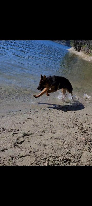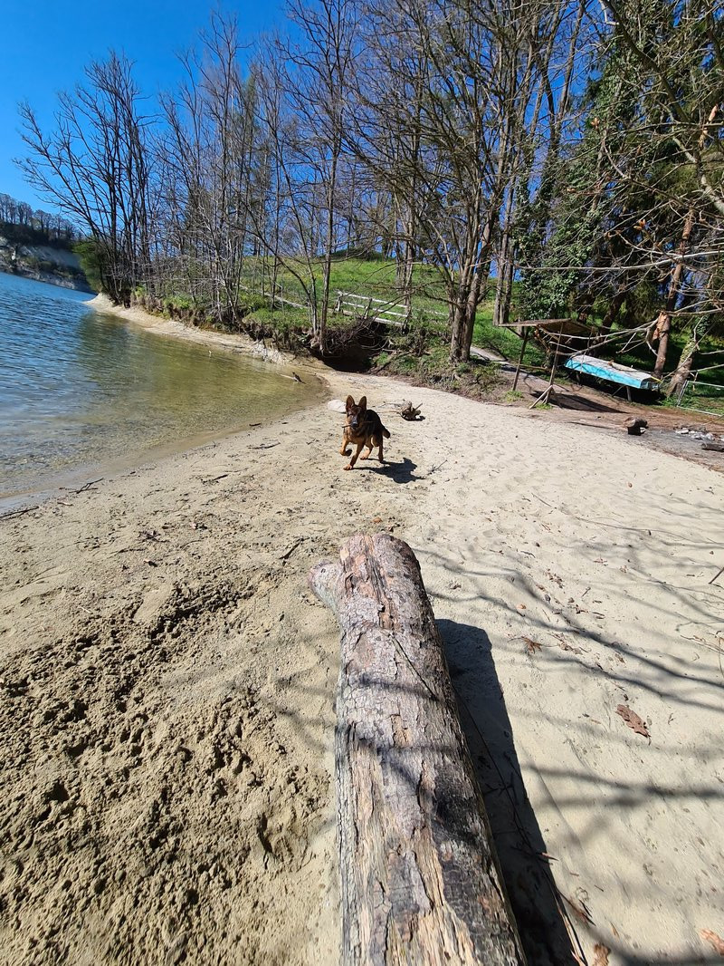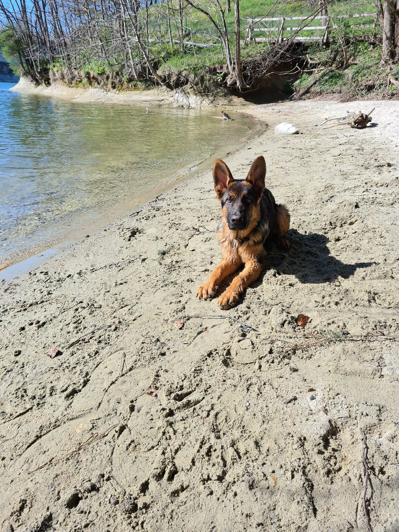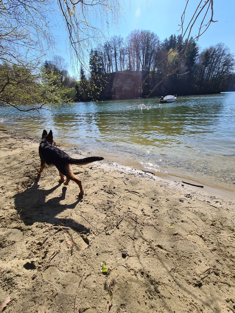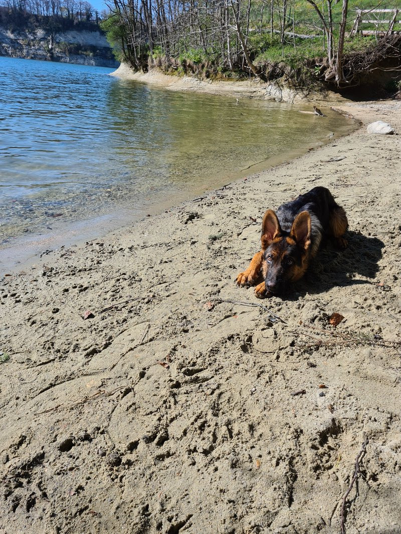 ich war sooooo stolz auf ihn. 15 Autominuten entfernt ist ein kleiner Strand sowie ein See. Da Romeo aktuell immer durch den ganzen Bach hier unten rennt dachte ich er freut sich bestimmt. Oben beim Parkplatz hats ein Restaurant, wo ganz viele Leute auf der Terrasse sassen ( Terrassen sind bei uns geöffnet). Da war ein Mann mit einem Mischlingshund, der hat gebellt wie wild. Romeo hat ihn nichtmal angesehen und den Herrschaften sind fast die Augen rausgefallen, der böööse Schäferhund der nicht bellt, ha, was musste ich heimlich in mich rein Schmunzeln ^^ Als Sahnehäubchen bin ich dann noch stehen geblieben und Romeo hat brav sitz gemacht, während der andere Hund weiter fröhlich weiter gekläfft hat. Unten am Wasser stand dann ein Mann, Romeo will aktuell immer zu allen Leuten hin und heute hab ich ihm einfach vertraut und ihn losgelassen. Er ist in diesen 20 Minuten als der Mann dort stand nicht ein einziges mal hin und hat auf mein einmaliges NEIN gehört.