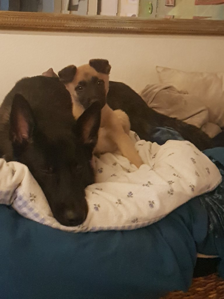wollte mich mal vorstellen. Bin neu hier. Ich hab einen fast 2 Jahre alten Herderrüden und seit 2 Wochen noch eine Malidame (12 Wochen alt). Mein Rüde ist ein ausgeglichener und lieber Kerl, der für die Kleine ein liebevoller Ziehpapa ist. Sie kam als Notfall zu uns von einem Bauernhof, wo sich die Tiere unkontrolliert vermehrt haben und das Veterinäramt eingeschritten ist. Das Muttertier hatte nicht genug Milch für die Welpen und wir peppeln sie jetzt auf (ist etwas kleiner, als sie sein sollte, wegen des Eiweismangels). Trotzdem hat sie ein unfassbares Selbstbewusstsein und hat es mit 10 Wochen geschafft, einer DSHDame den Kauknochen abzuknurren, weil sie nicht nachgibt. Diese Maus wird eine Herausforderung, weil sie einfach nicht nachgeben will und ein extrem starkes Wesen hat.:-) Derzeit kümmere ich mich um ihre Sozialisierung, damit sie von anderen Hunden in ihre Schranken gewiesen wird und etwas Zurückhaltung lernt, was ganz gut klappt. Unser Herder hört aufs Wort, ist eine liebe Seele, aber draussen natürlich auch ein Geschoss auf 4 Pfoten, das mit Lichtgeschwindigkeit Kommandos ausführt, oder spielt.