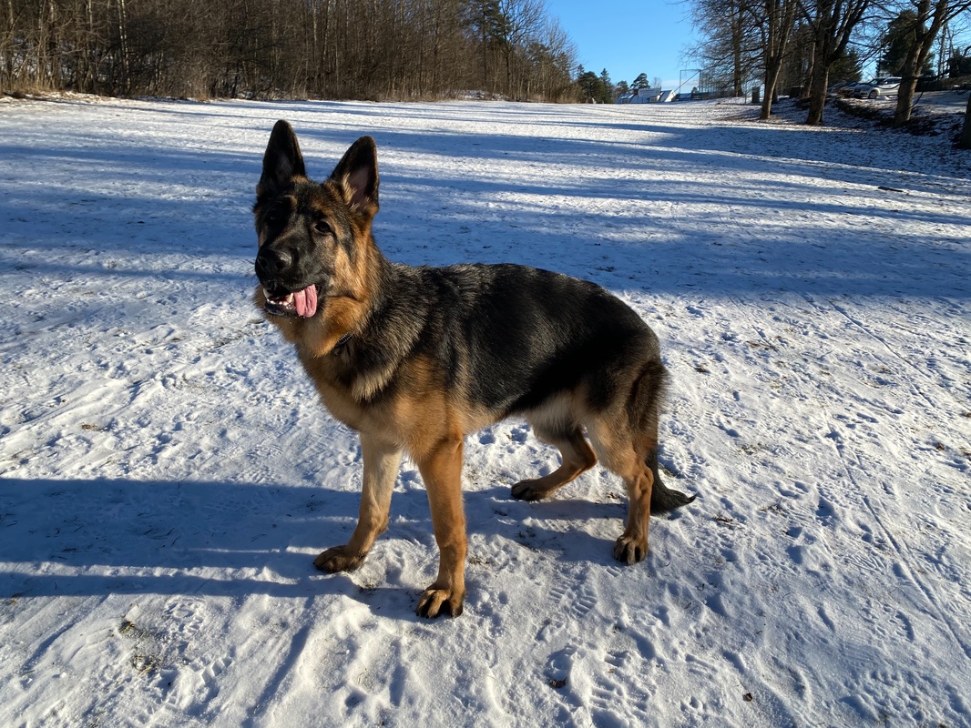 dem sie 8 Wochen alt war. Sie ist registriert im Norwegischen Kennel Klub, ihre Eltern (und Vorfahren) sind HD/AD freie und haben beide mindestens IPO 1.