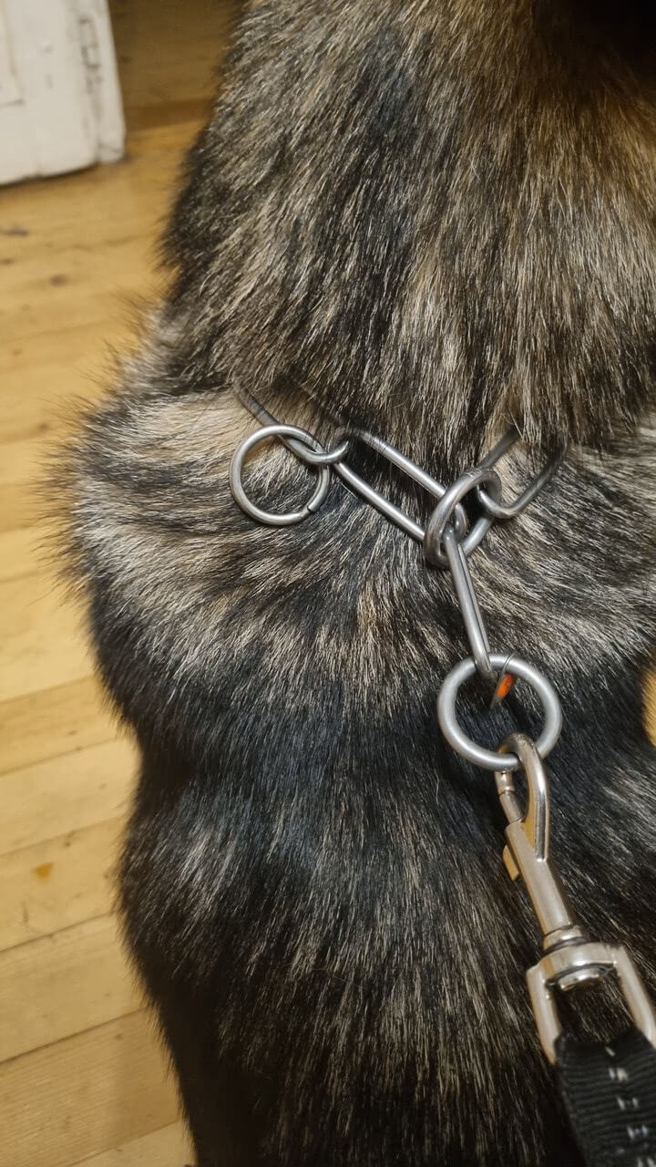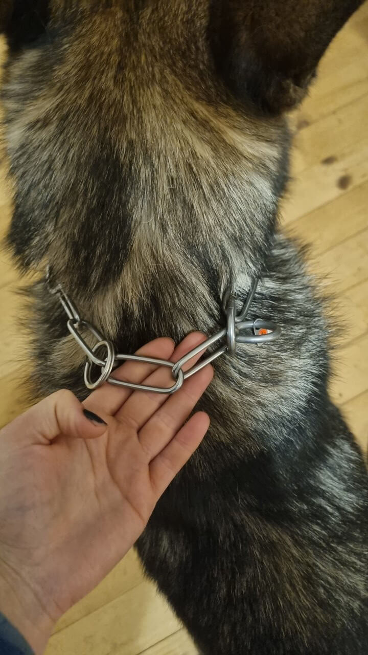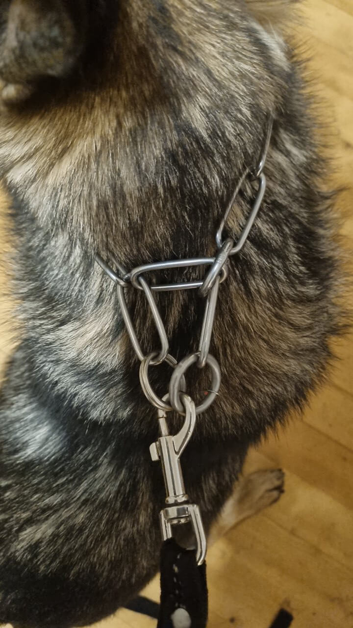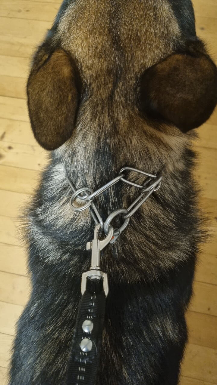 Wenn der Hund die Kette dann anhat schlackert sie eben wie du sagst rum, weil sie ja so groß ist dass sie gut über den Kopf drüber geht. Deshalb hake ich dann den Karabiner von der Leine am "Zugring" ein, ziehe bis kurz vor den Splentring zu (dann müsste die Kette ungefähr so locker/eng sitzen wie ein Halsband mit Schnalle) und dann hake ich den Karabiner mit dem ersten Ring drin zusammen am Splentring wieder ein. Dann ist die Kette fix (zieht sich nichtmehr zu) und aber so eng wie ein Halsband. So lange bis zu die Leine abmachst halt.