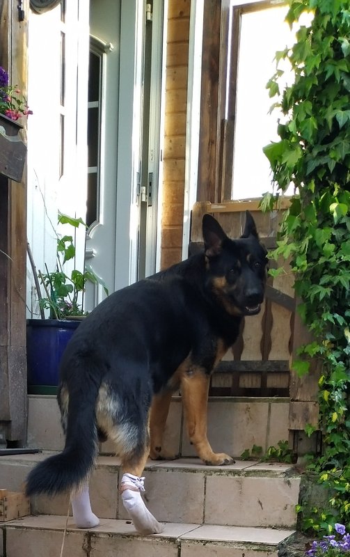 Jetzt ist Basko s Pfote groß verbunden, weil der 1 Riss sich , trotz aller Pflege und Vorsicht, entzündet hat.