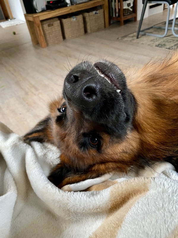 • Mich hat eine Bronchitis erwischt und mich quält ein schlimmer Husten. Sobald ich huste, kommt Boss angeflitzt und legt sich neben mich auf‘s Sofa. Er sieht mich dann mit großen Augen an und mag gar nicht weg von mir, erinnert mich sehr an meine gute Seele Max. Seine Lieblingsstelle am Hals wird gekrault und das sieht dann so aus: