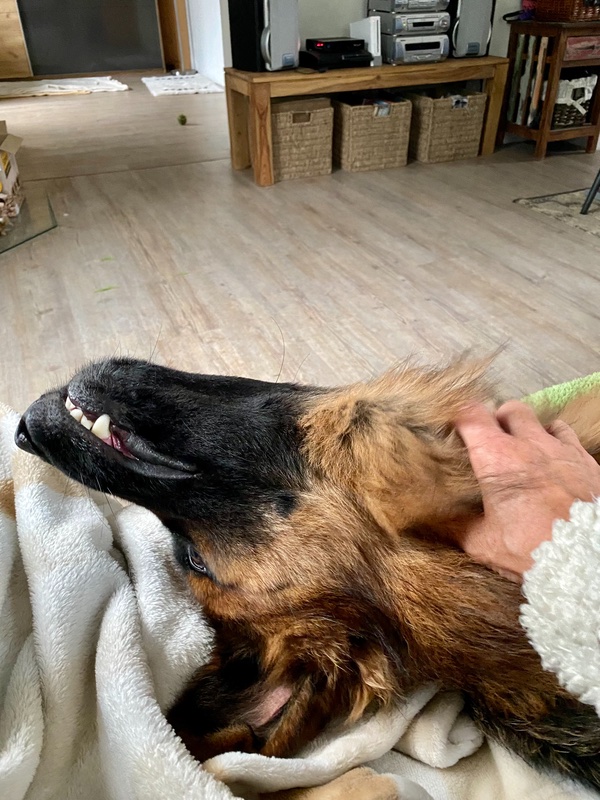 • Mich hat eine Bronchitis erwischt und mich quält ein schlimmer Husten. Sobald ich huste, kommt Boss angeflitzt und legt sich neben mich auf‘s Sofa. Er sieht mich dann mit großen Augen an und mag gar nicht weg von mir, erinnert mich sehr an meine gute Seele Max. Seine Lieblingsstelle am Hals wird gekrault und das sieht dann so aus: