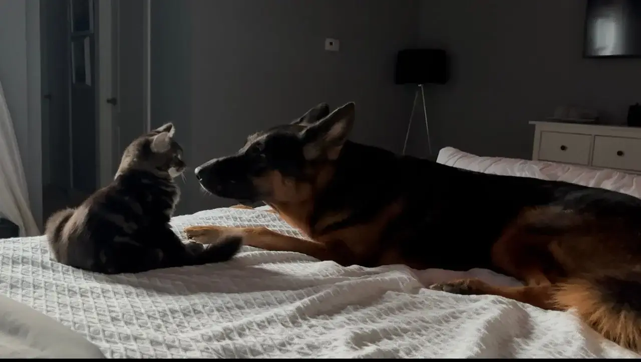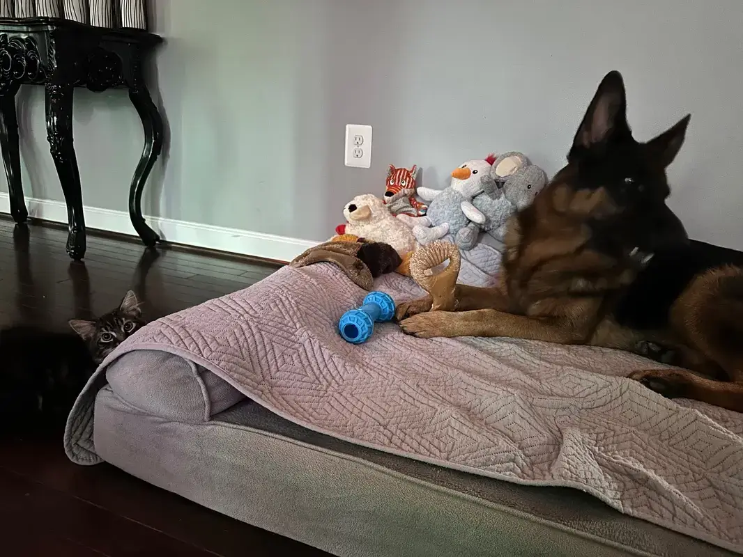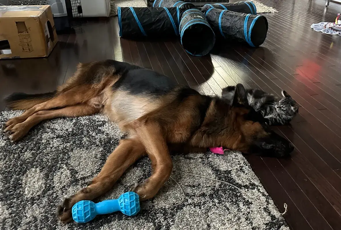 • Maline, noch nie eine Katze im Haus gehabt. Wir haben Katzen in der Nachbarschaft, die mal bei uns draußen am Zaun vorbeilaufen, wenn Tony draußen ist, und das war ihm auch immer egal. Also, ich wusste dass Tony mit einer Katze klarkommen würde, und glücklicherweise hatte ich Recht.