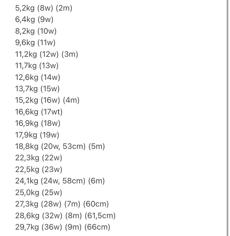 Ich hab ja auch so eine Liste. Brummi ist ein Rüde, war aber die erste Zeit ziemlich klein und zweitweise auch sehr dünn. Die Größe habe ich allerdings anfangs nicht gemessen - was ich ein bisschen bereue und ab Woche 20 dann auch nur noch unregelmäßig und nun wird er eigentlich nur noch alle 4 Wochen gemessen und gewogen - bis er 12 „Monate“ (48 Wochen) alt ist bzw abschließend am Tag seiner Geburt.