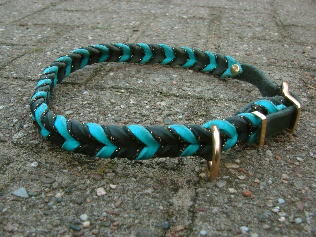 Nachdem ich vor 6 Monaten das Material bestellt und mit dem Flechten angefangen hatte und dann merkte, dass ich es zeitlich einfach nicht schaffe, das Halsband zeitnah fertig zu stellen, kaufte ich dann halt eins in der Art. Das gab es aber nur in Türkis/ Cognac und zum einen war das Türkis eher bläulich und zum anderen wollte ich doch lieber was mit Türkis und Schwarz, weil das einfach besser zu Benes schwarzem Pelz passt. Ein bisschen Bling-Bling musste auch sein, aber ich habe auf Strassnieten verzichtet - die passen irgendwie nicht zu Bene - und nutzte statt dessen Paracord mit eingearbeitetem Goldfaden.
