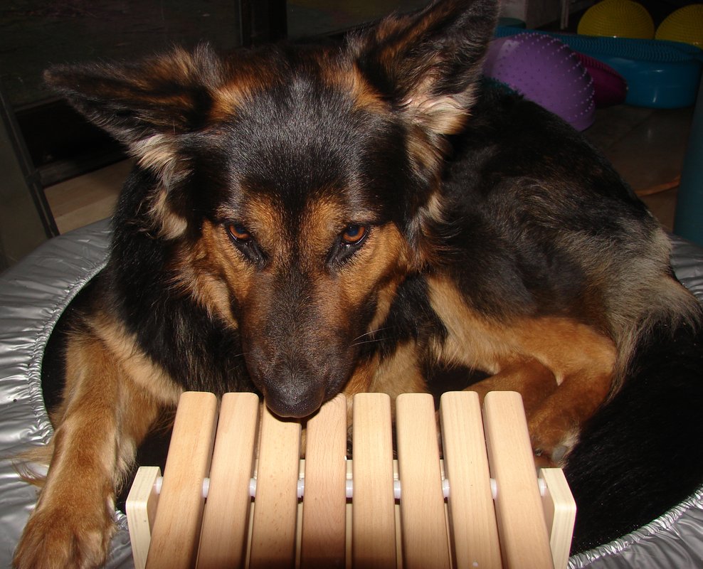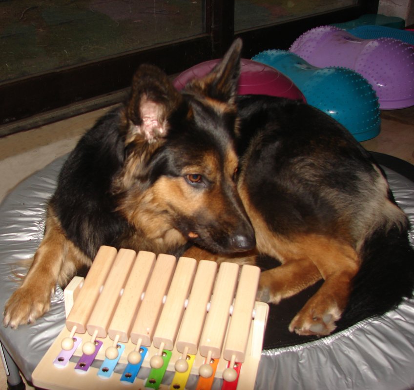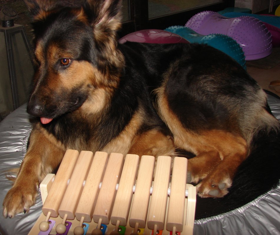 Ihr Geschenk fand sie durchaus interessant und sie hat dem Piano, das ja eher ein Xylophon ist, auch ein paar Töne entlockt. Wobei das Hundepiano nicht gerade klare Klänge produziert, sondern eher dumpfes Klimpern. Vielleicht soll das ja aber auch so sein, damit der Hund keinen Schreck bekommt, wenn er auf die Klöppel drückt.