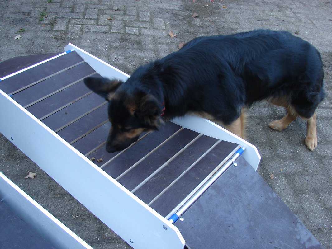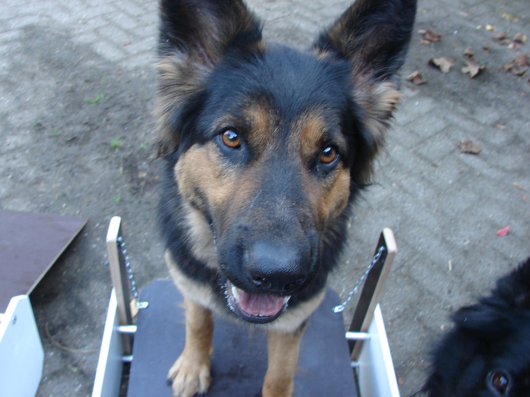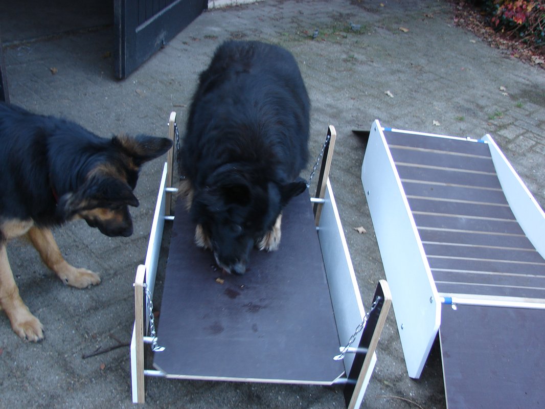 Die Wackelbrücke wird von ihr eher seitwärts bestiegen, aber sie ist tatsächlich schon einmal drübergelaufen ... gut, mit festhalten und Kekse vor der Nase, aber sie traute sich. Es ist allerdings schwierig, den Hund zu halten und zu fotografieren, aber ich bin zuversichtlich, dass ich demnächst auch Fotos zeigen kann, auf denen die Hunde über die Geräte laufen oder auf der Wackelbrücke sitzen ... dann wird das Fotoknipsen leichter ;)
