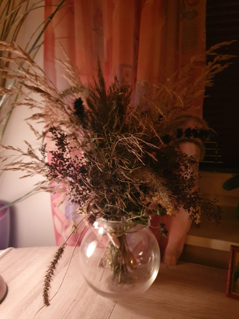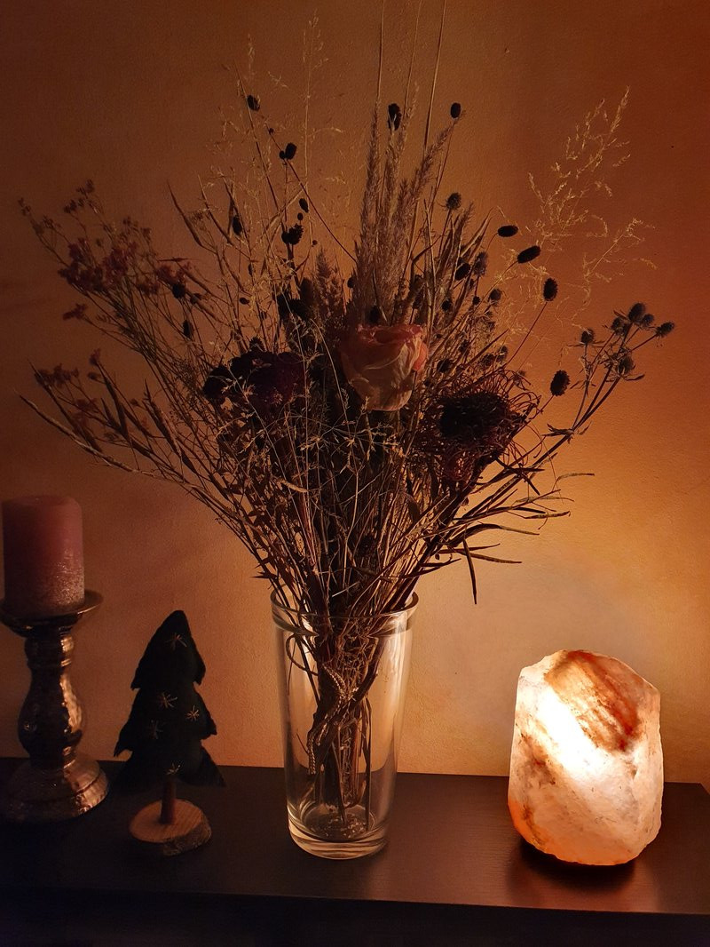 Und Blumen und Pflanzen sind auch so mein Ding. Im Sommer sind Sam und ich manchmal stundenlang unterwegs, nicht weil wir so weit gehen, sondern weil ich Blumen und Gräser und alles mögliche suche und pflücke. Die werden dann umgedreht erst einmal aufgehängt und später nochmal ein bisschen mit Dinge aus dem Blumenladen (eisgefrorene Rosen) aufgepeppt. Das ist immer total schön, wenn ich durch die Wohnung gehe und dann ist hier ein Strauß den "wir" hier oder dort gepflückt haben oder der andere Strauß den wir wieder woanders uns zusammengepflückt haben. Klar hilft mir Sam dabei, indem er so manches Büschlein selbst ausreißt und mitnimmt. Das sind hauptsächlich jetzt im Winter ganz tolle Erinnerungen und nächstes Jahr, werfe ich die weg und wir pflücken wieder neue.