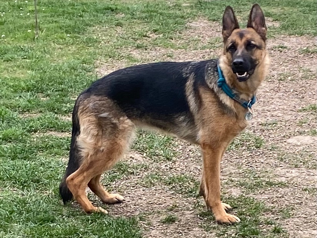 Selbe Hündin "ungestellt" und etwas "zusammengeschoben"... Ich denke man erkennt den Unterschied in der Rückenlinie, im Vergleich zum (einigermaßen) korrekten Stand.
