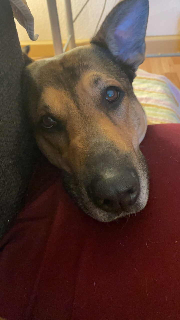 Er wohnte weit weg von mir und wir hatten uns wegen Corona fast ein Jahr lang nicht mehr getroffen. Ich erfuhr von seinem Tod erst unserem Arbeitgeber, der auch netterweise den Kontakt zu seiner Schwester herstellte. Meine zweite Frage, gleich nach dem „Warum?!“ war: „Wo ist der Hund?!“. Ellee war zu dem Zeitpunkt 4 Jahre jung, befand sich 2 Tage lang mit dem Toten alleine im Haus, wurde von Feuerwehr und Polizei rausgeholt und ins Tierheim verbracht., weil Mutter und Schwester den Hund nicht halten können. Ich war am Boden zerstört, hab nur noch geheult und das Tierheim angerufen. Da es Freitags Nachmittag war, ist niemand ans Telefon gegangen. Ich habe also eine Mail geschrieben und war das Wochenende über ein heulendes Häufchen Elend am Rande des Nervenzusammenbruchs. Montags bekam ich endlich den Anruf vom TH, in dem besprochen wurde, dass ich Ellee übernehmen kann.