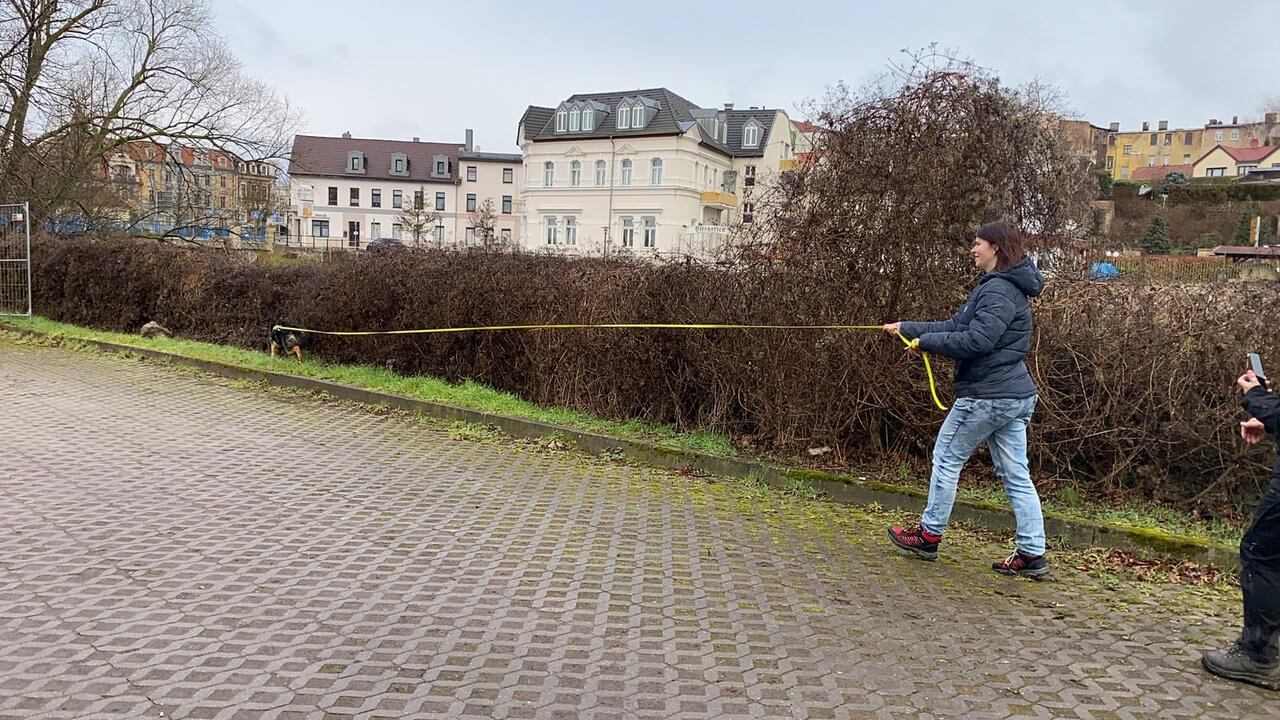 • Der Anfang ohne Leine ist auch interessant. Bei uns gabs nie ohne Leine, da war von Beginn an die Leine dran, ansonsten haben wir das auch immer so aufgebaut. Zuerst sah der Hund die Person noch, dann war die plötzlich weg, aber ganz nahe und schön langsam wird die Distanz aufgebaut.