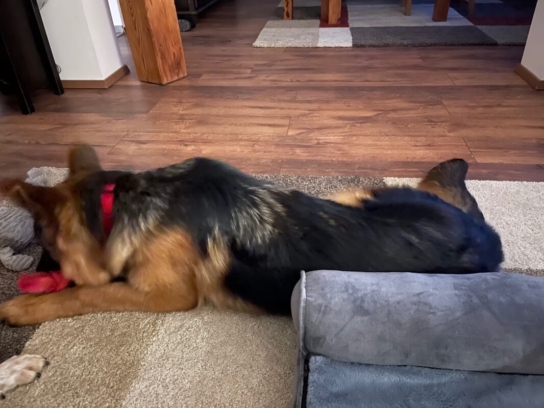 Da Rex seit Wochen unruhig läuft und der Züchter dies auf den Wachstum zurückgeführt hatte, haben wir uns keine Gedanken gemacht. Als es nicht weg ging und er immer unruhiger läuft, ist der Züchter zum Tierarzt seines Vertrauens gegangen.
